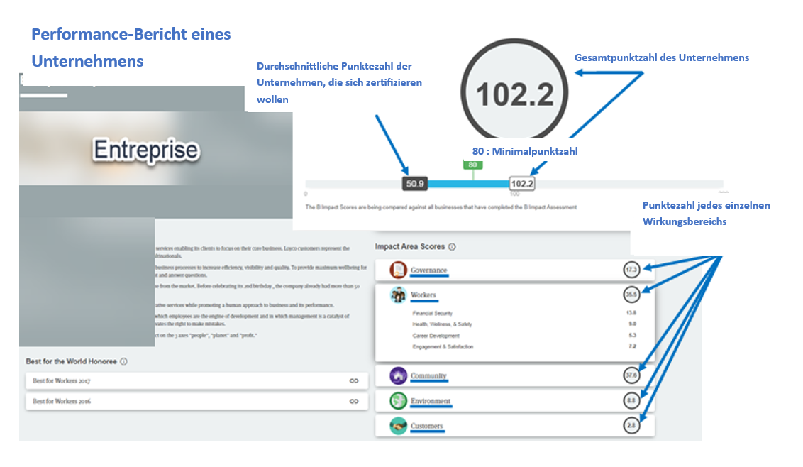 Das B Impact Assessment ist ein Online-Tool, das zunächst eine Selbstevaluation (kostenlos) ermöglicht. Das Unternehmen kann dann den Prozess fortsetzen, um die B Corp-Zertifizierung zu erhalten.