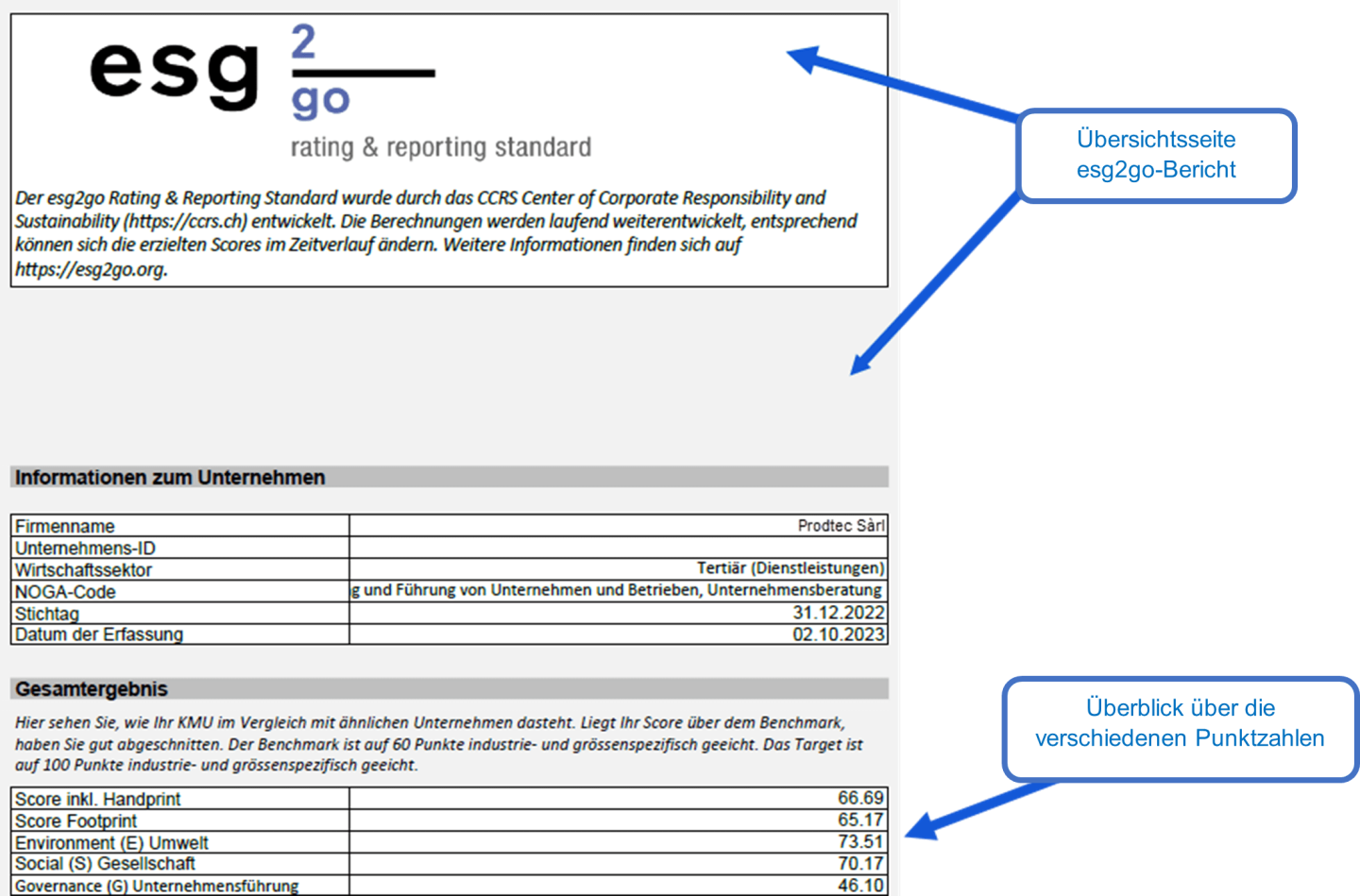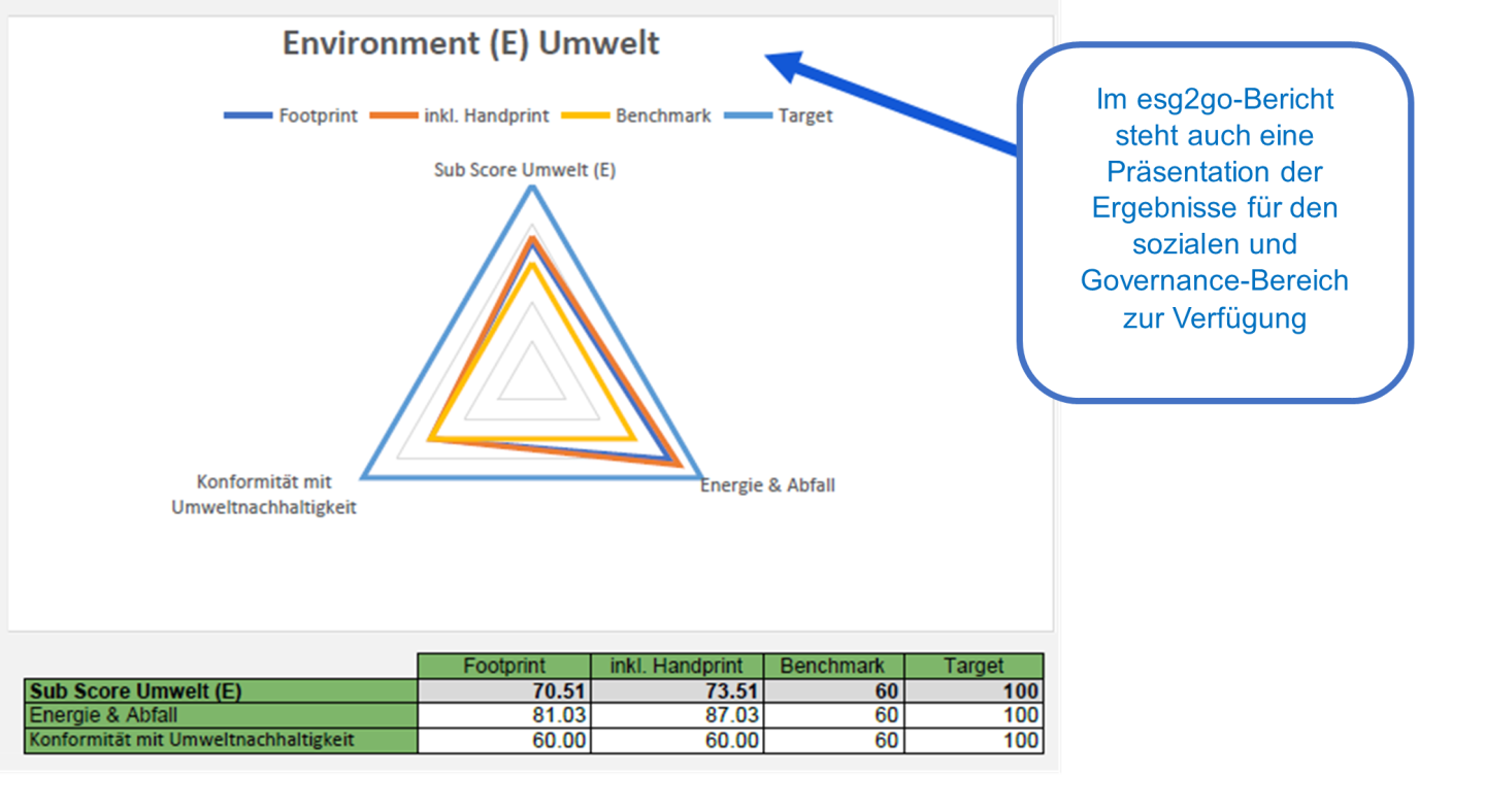 - esg2go-Berichte: Leistungsberichte, die die Punktzahlen in den Bereichen Umwelt, Gesellschaft und Unternehmensführung mit einem Branchen-Benchmark enthalten