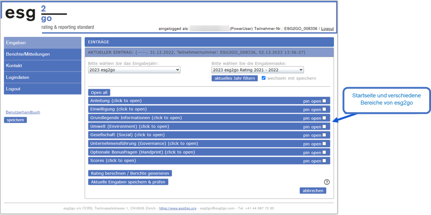 esg2go besteht aus drei einführenden Abschnitten und vier Abschnitten, in denen die Daten eingegeben werden müssen. Die ersten drei Abschnitte sind: