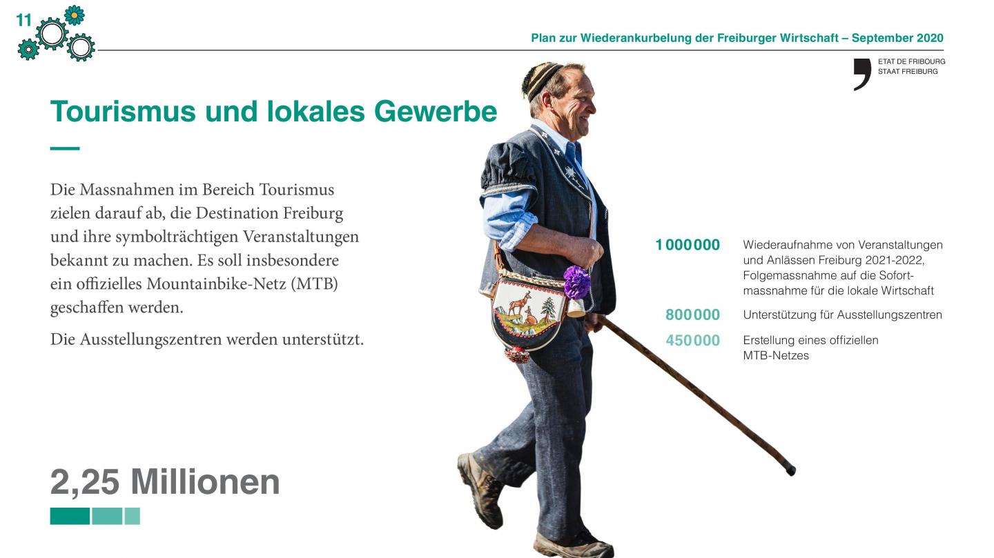 - Beschreibung der Massnahme: Die Massnahme sieht die Unterstützung der beiden kantonalen Ausstellungszentren (Forum Fribourg und Espace Gruyère) vor, bei denen aufgrund des vom Bundesrat verhängten Versammlungsverbots fast alle in ihren Räumlichkeiten organisierten Veranstaltungen abgesagt wurden. Sie wird es den genannten Zentren somit ermöglichen, die Reservation und Organisation von Veranstaltungen unter Einhaltung der Gesundheitsmassnahmen, die in den kommenden Monaten weiterhin gelten, wiederaufzunehmen. Angesichts der Bedeutung dieser Zentren für die kantonale Wirtschaft und den Tourismus werden die im Rahmen des Wiederankurbelungsplans gewährten Finanzhilfen ihnen auch den Übergang von der vollständigen Einstellung zur Wiederaufnahme ihrer Tätigkeit ermöglichen.