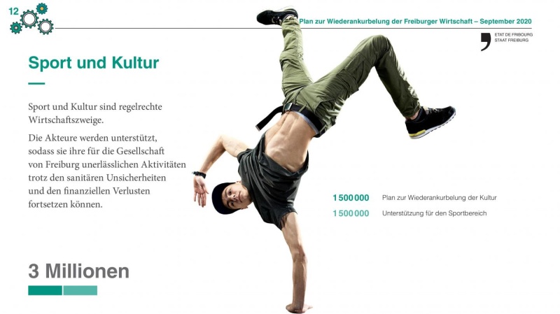 - Beschreibung der Massnahme: Das Ziel dieser Massnahme ist es, die starken Auswirkungen der Gesundheits- und Wirtschaftskrise auf die Sportklubs und -vereine im Kanton Freiburg abzufedern. Sie ist deshalb auf die Hauptfinanzierungsquelle des Sports ausgerichtet: das Sponsoring. In diesem Zusammenhang ist erwähnenswert, dass der Kanton Freiburg fast 850 Klubs zählt, davon rund 30 in nationalen Ligen. 494 Athletinnen und Athleten und 28 Trainerinnen und Trainer, Technikerinnen und Techniker sind im Besitz einer Swiss Olympic Card und für die Schweizer Sportelite aktiv. Darüber hinaus berücksichtigt die Massnahme auch die zwischen Mai und September 2020 geplanten 45 Veranstaltungen mit mehr als 1000 Personen, deren Absage in den meisten Fällen einen Einkommensverlust für die Klubs bedeutet. Die meisten Sportvereine und -klubs des Kantons verfügen über sehr gute und gesunde Strukturen, die es ihnen ermöglicht haben, Notfälle zu bewältigen. Sie haben jedoch ihre Reserven stark beansprucht und werden ohne konkrete Unterstützung durch den Kanton langfristig nicht überleben können.