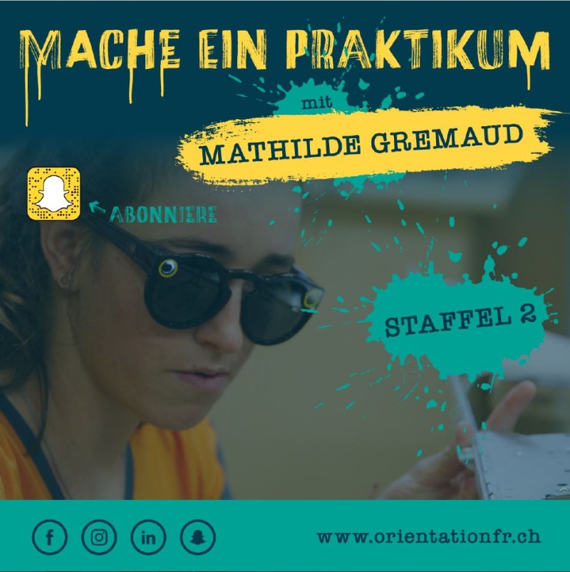 Nach dem Eis und dem Puck, ab auf die Ski und auf die Piste! Mathilde Gremaud entdeckt für euch verschiedene Berufe. In unterschiedlichen Betrieben hat sie eine Schnupperlehre gemacht. Dank ihrer Snapchat-Brille könnt ihr sie auf Snapchat miterleben. Die Zusammenfassungen der Schnupperlehrern findet ihr auf dieser Seite.
