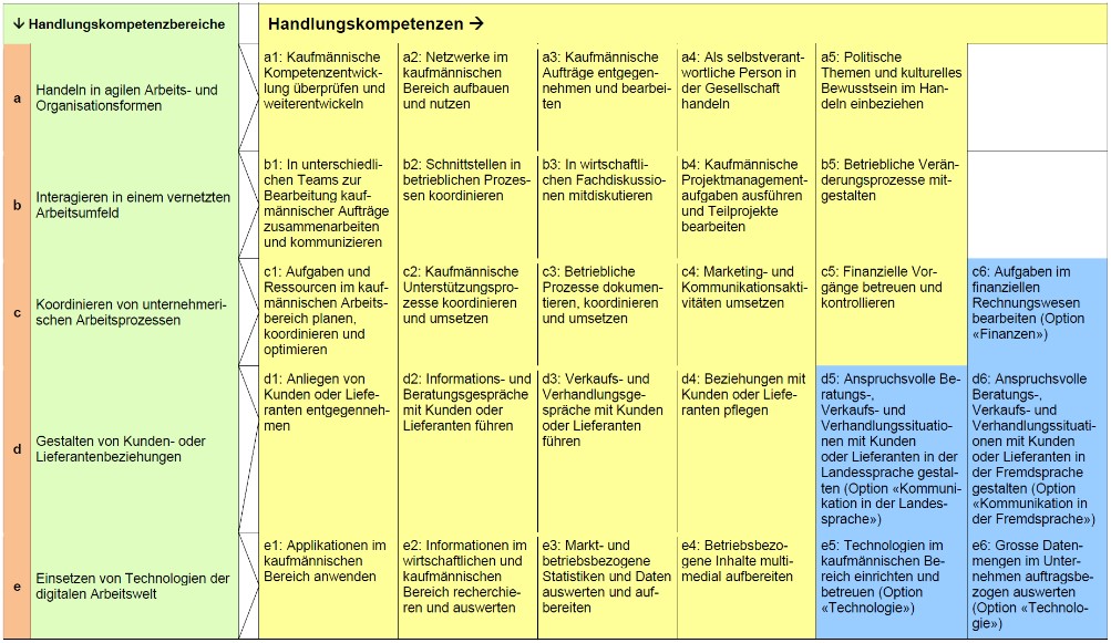 Es handelt sich um die Beschreibung der fünf Handlungskompetenzbereiche. Jeder Bereich besteht aus mehreren Handlungskompetenzen, die im Betrieb, in der Berufsfachschule und in den überbetrieblichen Kursen behandelt werden.