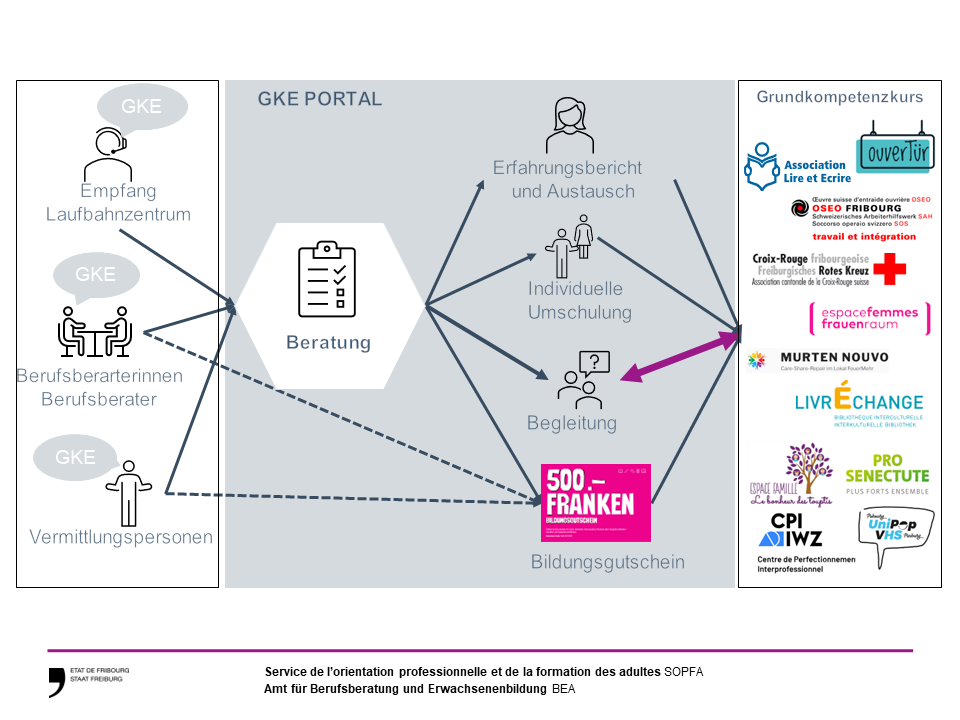 Wenn Sie mit Erwachsenen in Kontakt stehen, die von diesem Angebot profitieren könnten, können Sie ihnen vorschlagen, die kostenlose Permanence am DONNERSTAGS von 9.30 bis 11.30 Uhr im Laufbahnzentrum, Rte des Arsenaux 41, 1700 Freiburg zu besuchen.