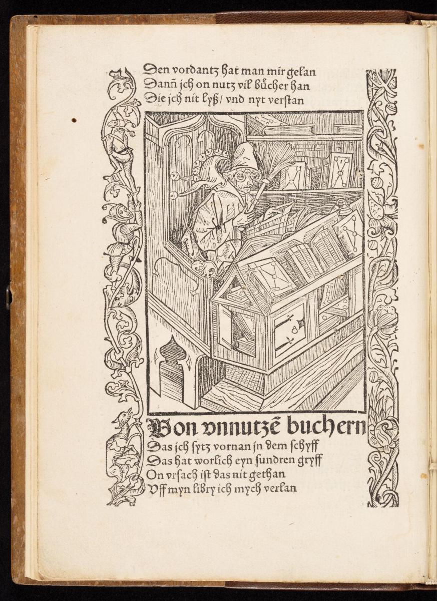 Das Narrenschiff ist auch ein Meisterwerk der Druckkunst. Heute sind von der im Februar 1494 erschienen Erstausgabe nur noch vierzehn Exemplare erhalten, darunter das Freiburger Exemplar. Die sorgfältige Typographie, das elegante Layout, die einzigartigen Bordüren und ausdrucksstarken Holzschnitte, die dem jungen Albrecht Dürer zugeschrieben werden, haben zum Mythos dieses Drucks beigetragen.