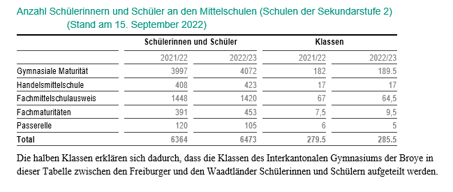 Schülerinnen und Schüler Klassen 2021/22 2022/23 2021/22 2022/23 Gymnasiale Maturität 3997 4072 182 189,5 Handelsmittelschule 408 423 17 17 Fachmittelschulausweis 1448 1420 67 64,5 Fachmaturitäten 391 453 7,5 9,5 Passerelle 120 105 6 5 Total 6364 6473 279,5 285,5 -