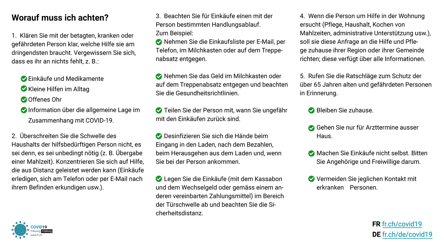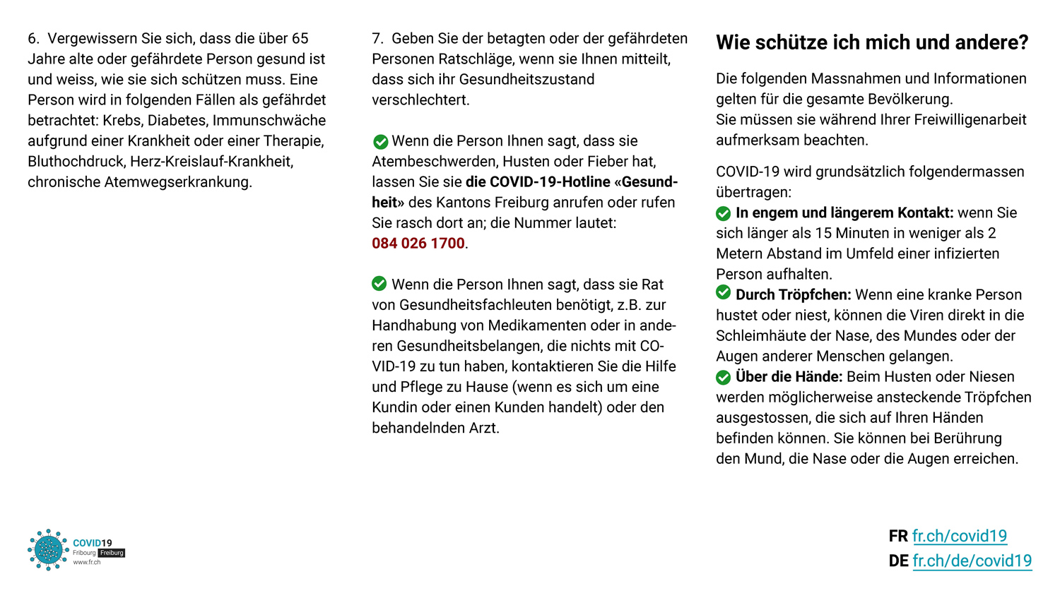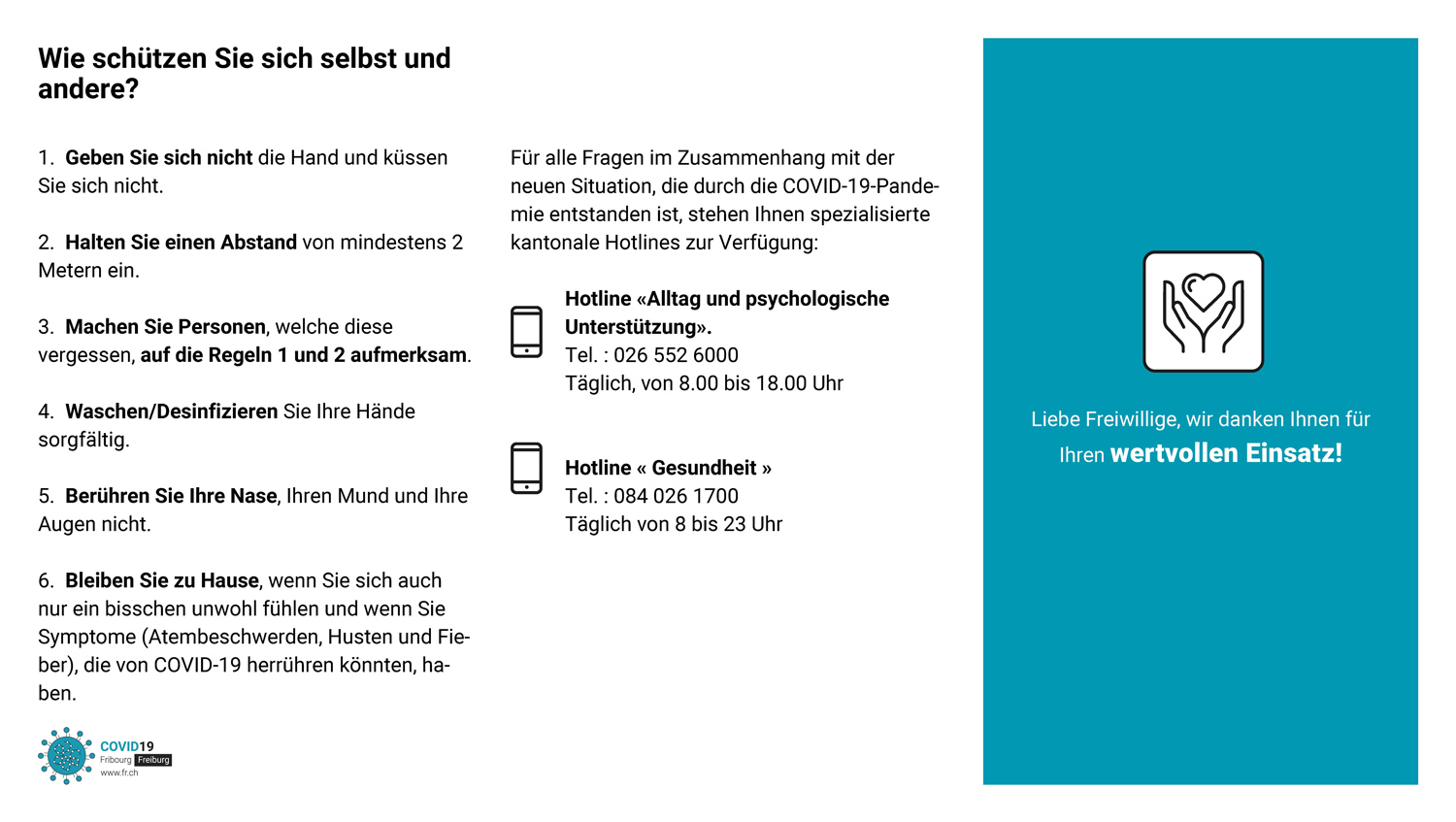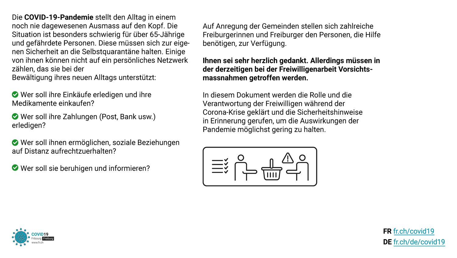 Auf Anstoss unter anderem der Gemeinden stellen sich zahlreiche Freiburgerinnen und Freiburger den Personen, die einen Bedarf anmelden, zur Verfügung. Ihnen sei sehr herzlich gedankt.