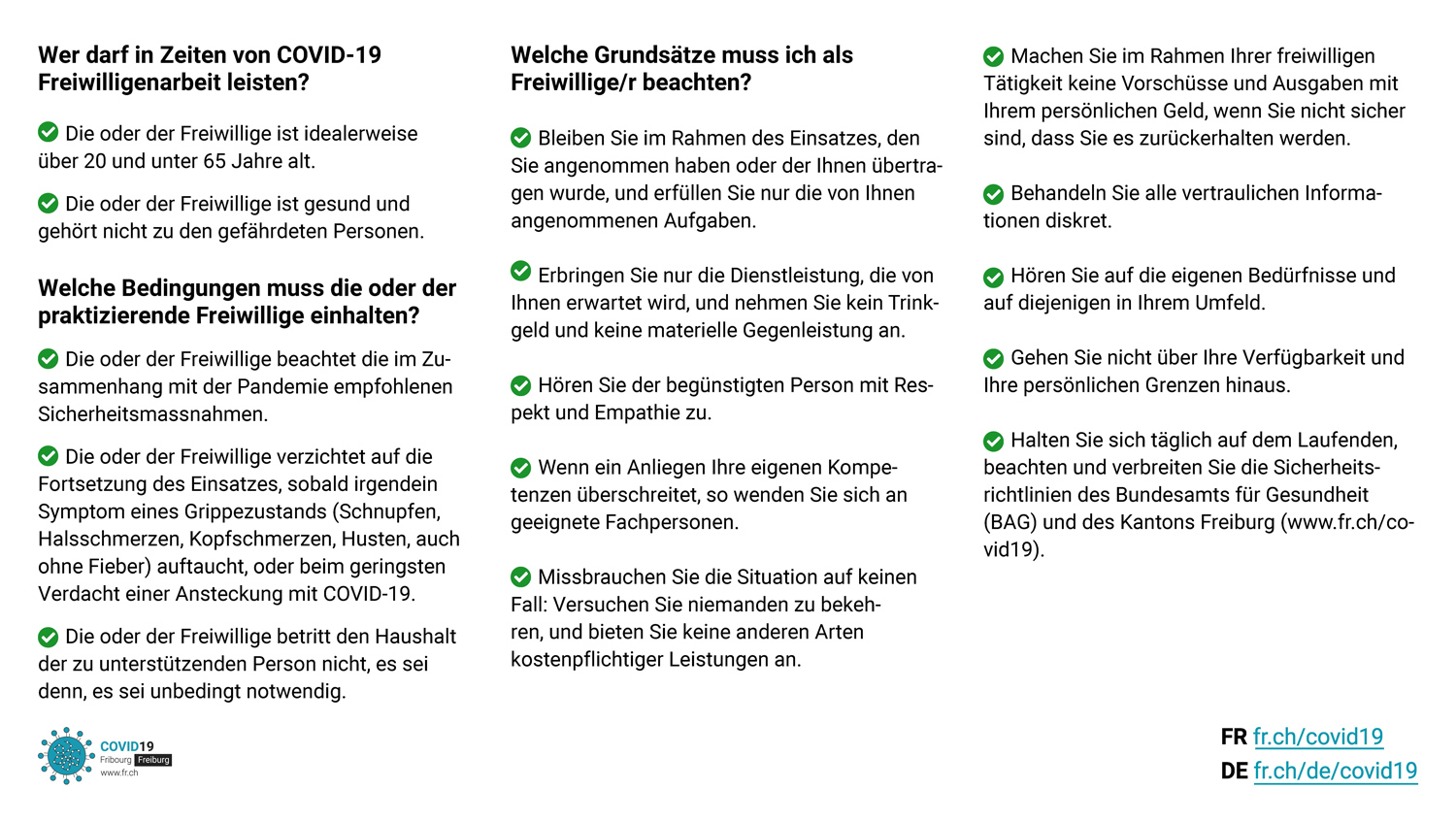 In diesem Dokument werden die Rolle und die Verantwortung der Freiwilligen während der Corona-Krise geklärt und die Sicherheitshinweise in Erinnerung gerufen, um die Auswirkungen der Pandemie möglichst gering zu halten.