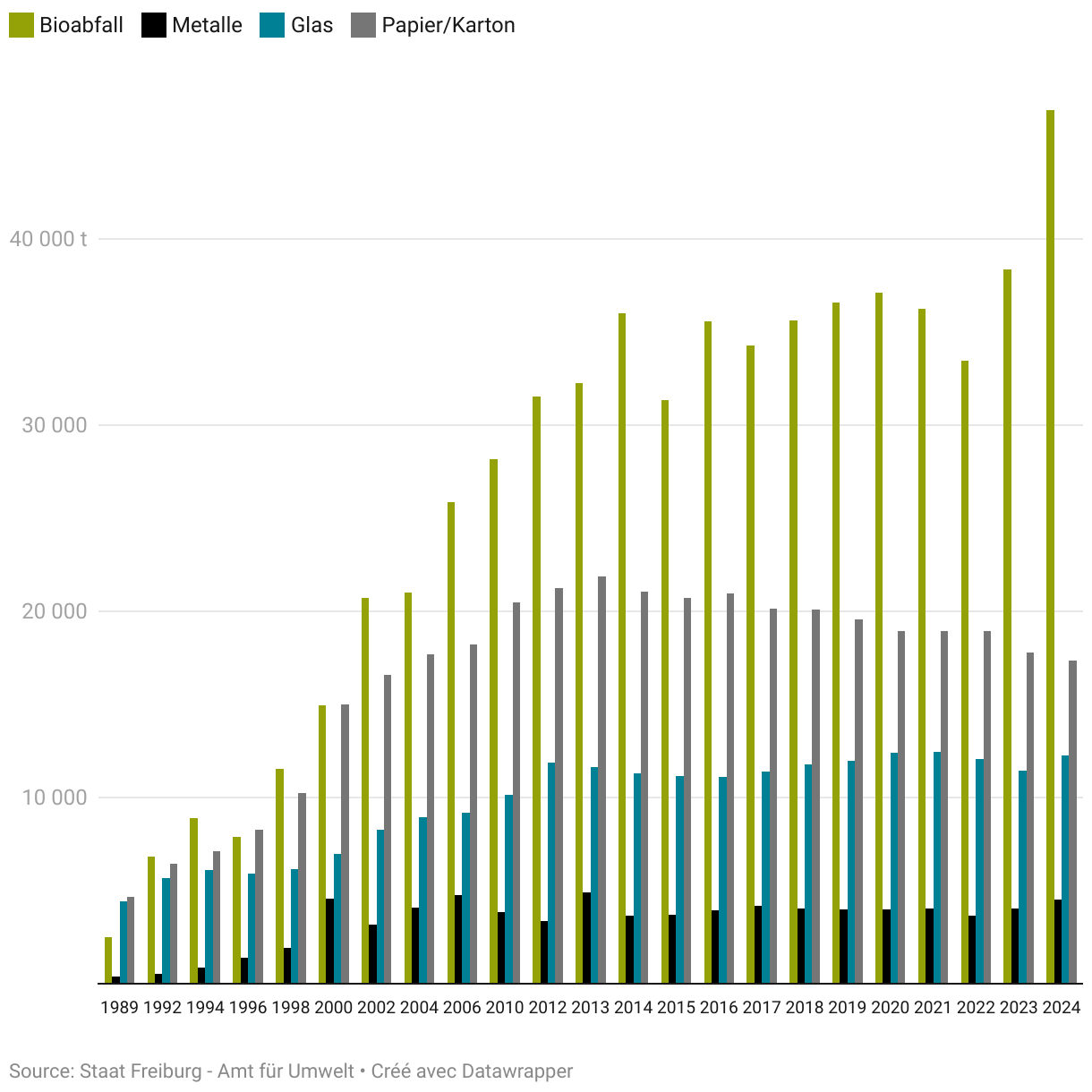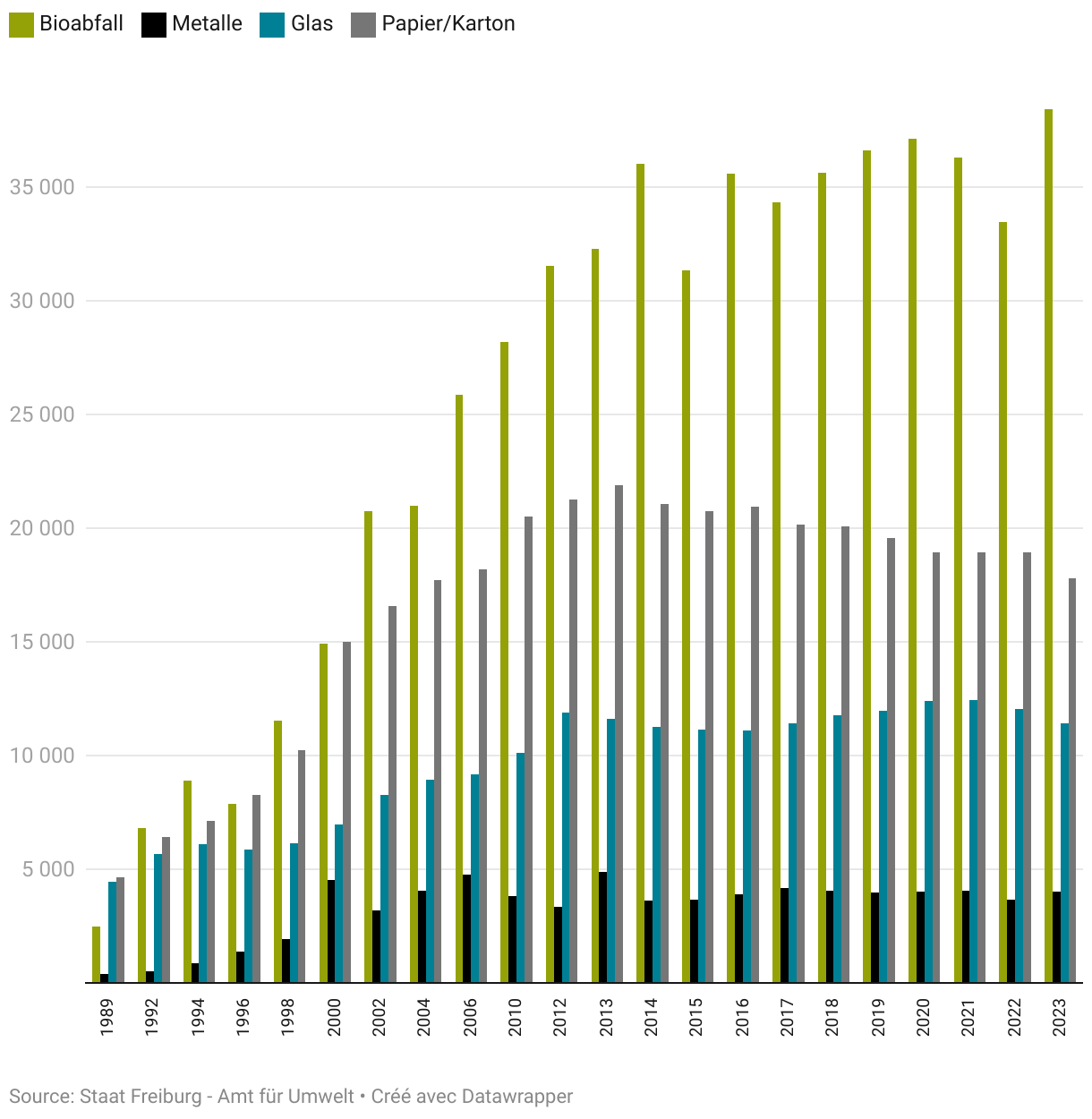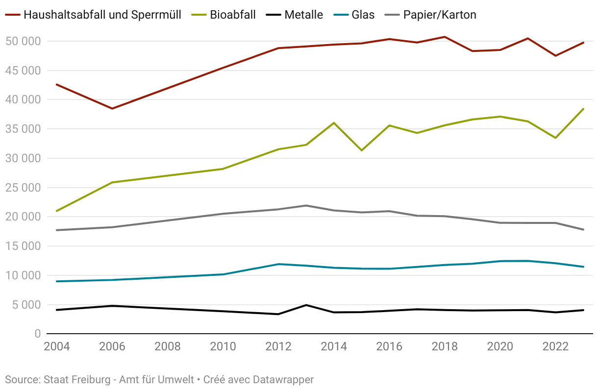 Die nachstehenden Ergebnisse wurden in Tonnen berechnet. Es gibt jedoch zahlreiche Abfälle – besonders die biogenen Abfälle (kompostier- und vergärbare Abfälle) –, die in Volumen (m3) berechnet wurden, was wiederum bedeutet, dass einige Gewichtsangaben geschätzt und nicht direkt gemessen wurden. Des Weiteren gibt es zum Teil bedeutende Unterschiede bei der Qualität der durch die Gemeinden übermittelten Daten. Gewisse Angaben sind beispielsweise nicht beziffert (insbesondere die biogenen Abfälle). Demzufolge besteht eine nicht unbedeutende Unsicherheit über die vorliegenden Zahlen. Tendenz und Entwicklung der Abfallbewirtschaftung der Freiburger Gemeinde sind trotzdem klar erkennbar.