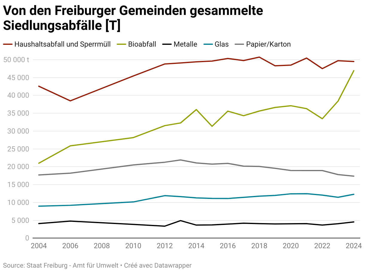 Im Jahr 2024 haben die Freiburger Gemeinden insgesamt 130'628 t Siedlungsabfälle gesammelt.