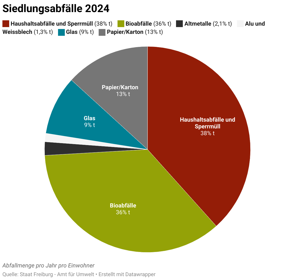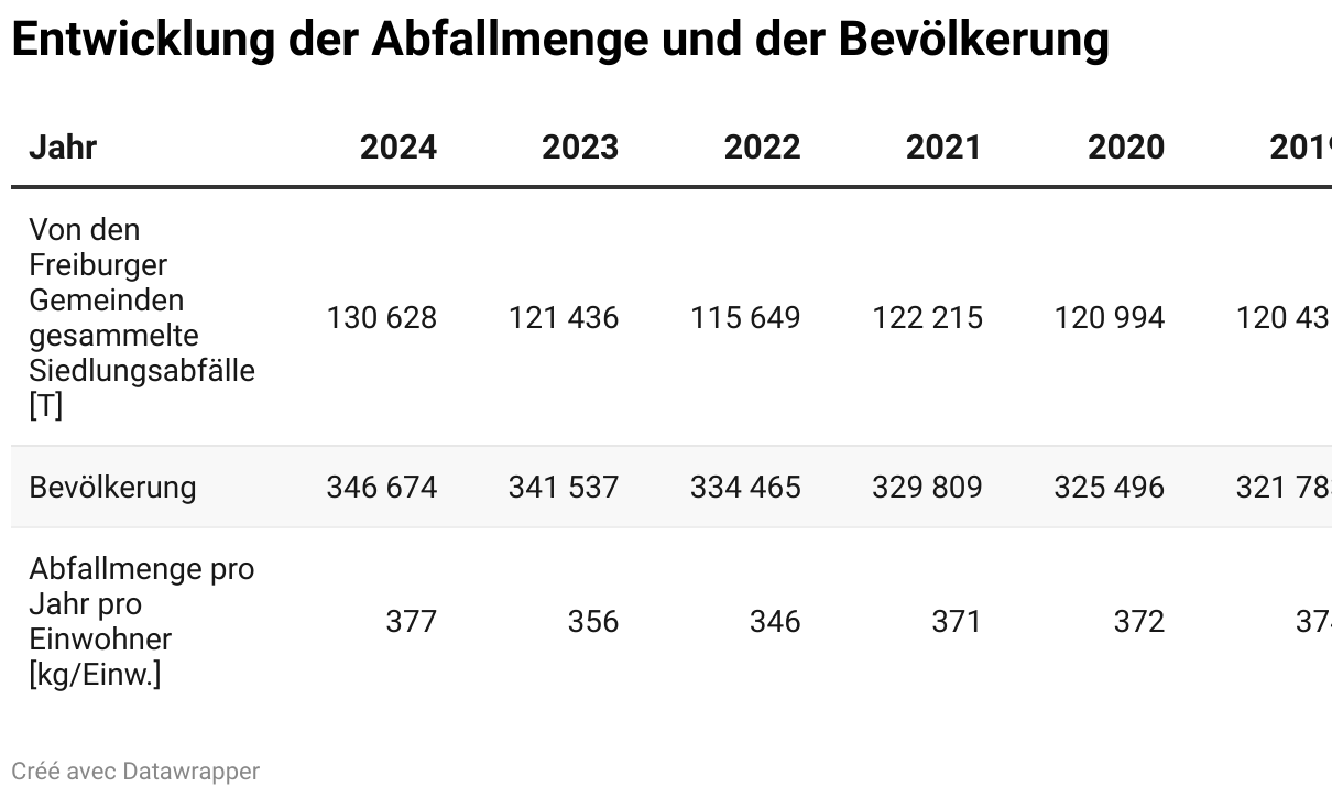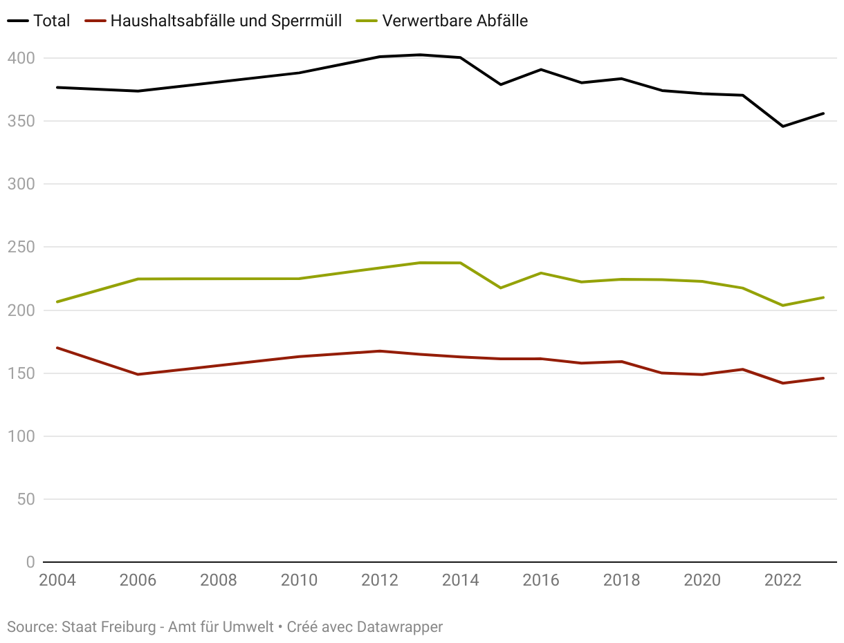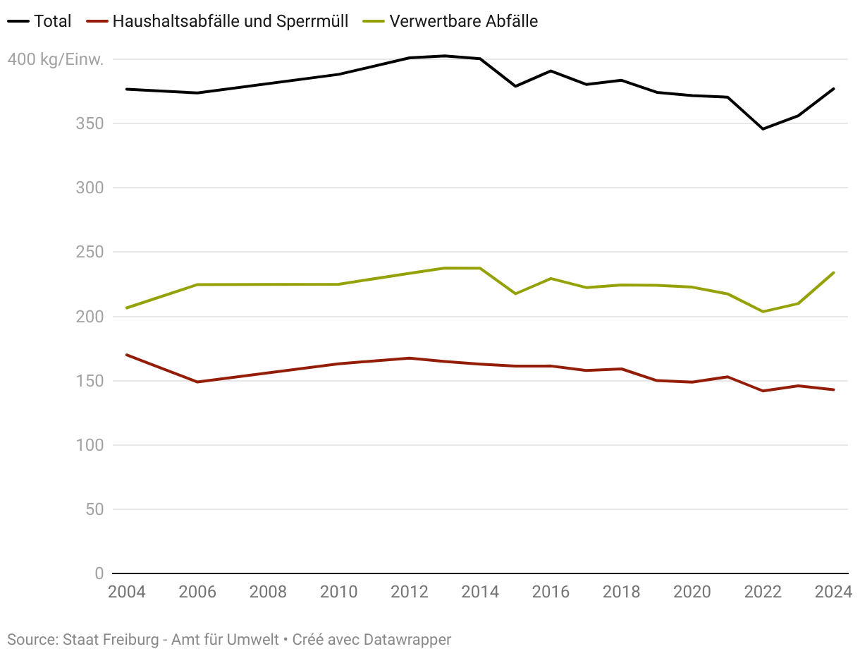 Im Jahr 2024 haben die Einwohnerinnen und Einwohner des Kantons Freiburg pro Person durchschnittlich 377 kg Siedlungsabfälle gegenüber 372 kg im Jahr 2002 produziert.