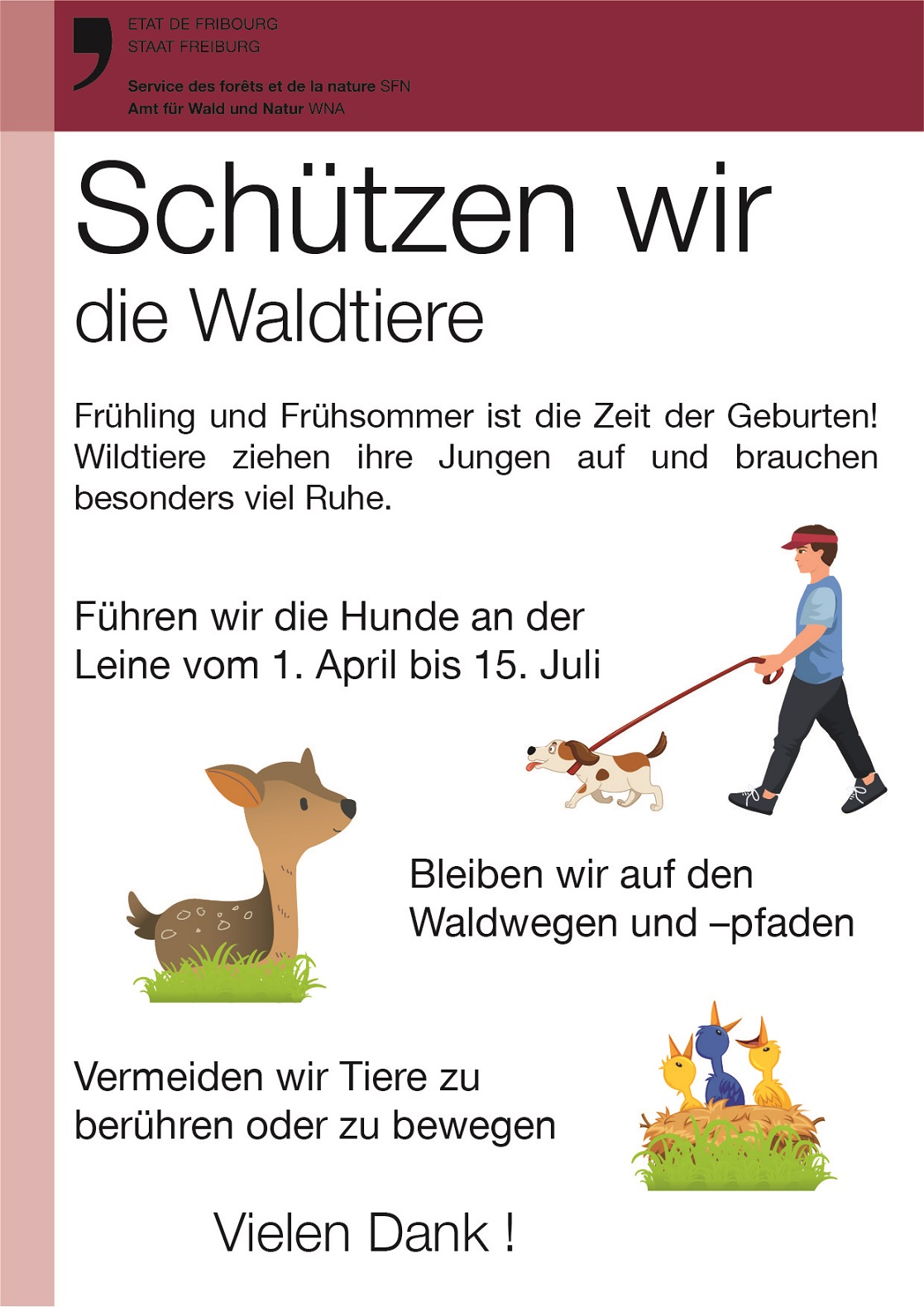 Im Wald sind Hunde vom 1. April bis 15. Juli obligatorisch an der Leine zu führen.