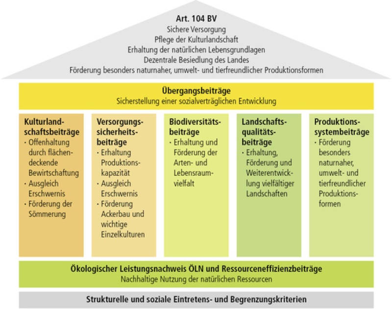 Alle Bewirtschafter mit zivilrechtlichem Wohnsitz in der Schweiz, welche einen anerkannten Landwirtschaftsbetrieb führen, nicht über 65 Jahre alt sind und eine landwirtschaftliche Ausbildung vorweisen können, haben die Möglichkeit, Direktzahlungen zu beantragen. Grundvoraussetzung ist die Erfüllung des ökologischen Leistungsnachweises ÖLN, dessen Einhaltung durch eine unabhängige Kontrollorganisation überprüft wird. Die minimale Betriebsgrösse, welche ein Betrieb erreichen muss, um Direktzahlungen zu erhalten, beträgt 0.20 Standardarbeitskräfte. Die Direktzahlungen setzen sich, wie auf dem nachfolgenden Schema ersichtlich, aus verschiedenen Beitragstypen zusammen.
