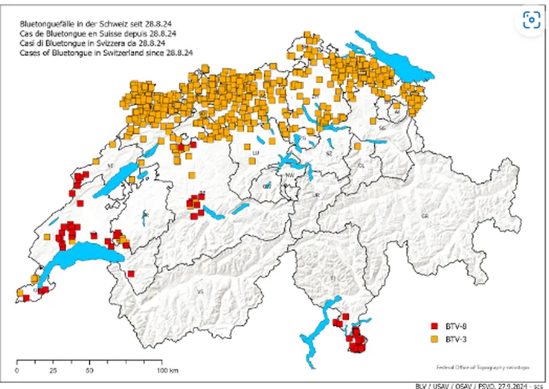 Die Infektion mit dem Blauzungenvirus des Serotyps 3 wurde am 29. August 2024 bei zwei Schafen im Kanton Jura und bei einem Schaf im Kanton Solothurn festgestellt. BTV-3 breitet sich seit 2023 in Europa aus und hat nun von Norden her die Schweiz erreicht. Der Tierverkehr in der Schweiz bleibt ohne Einschränkungen möglich. Die Blauzungenkrankheit wurde 2007 erstmals in der Schweiz festgestellt. Damals war jedoch die Variante Serotyp 8 (BTV-8) in Umlauf. Zwischen 2008 und 2010 führte die Schweiz ein umfassendes Impfprogramm durch.Massnahmen zum Schutz der NutztierbeständeTiere vollständig vor Mücken zu schützen, ist kaum möglich. Mückennetze und physische Barrieren können aber die Wahrscheinlichkeit reduzieren, dass Mücken die Tiere stechen und das Virus verbreiten. Der Einsatz von Insektiziden und Repellentien kann zusätzlich helfen, die Anzahl der Mücken im Stall und in der Umgebung der Tiere zu reduzieren. Zudem wird empfohlen, stehendes Wasser zu entfernen, da dies ein idealer Brutplatz für Mücken ist.
