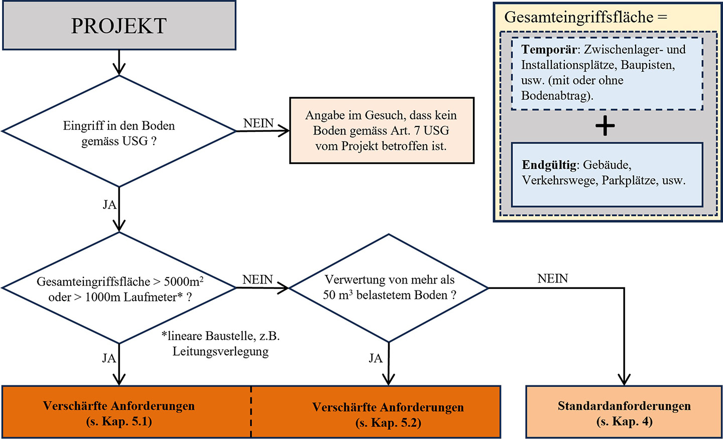 Der Staat Freiburg hat zwei Anforderungsniveaus für den Bodenschutz auf Baustellen festgelegt, die sich nach der Grösse des Projekts (Gesamtfläche) und der chemischen Qualität richten.
