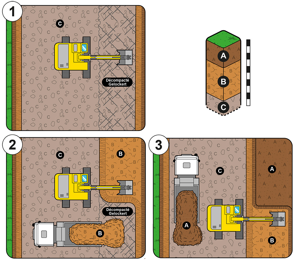 - Den Boden entweder vom begrünten A-Horizont, von einer Baupiste oder vom C-Horizont aus abtragen (siehe Abbildung unten).