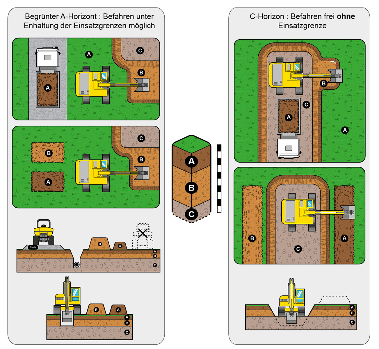 - Maschinen mit Industriereifen (Dumper, Lastwagen, Reifenbagger) dürfen nur auf Horizont C oder auf Baupisten fahren.