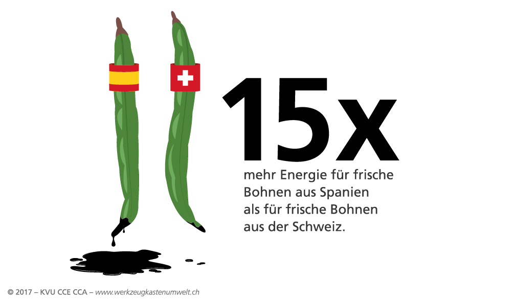 Die Umweltbelastung durch die Ernährung in den Bereichen Klima (CO2-Belastung), Treibhausgasemissionen und Verbrauch fossiler Energien ist auf verschiedene Faktoren zurückzuführen: die Fleischproduktion, den Lufttransport von Gemüse, den Gemüseanbau in fossil beheizten Gewächshäusern, die fürs Einkaufen benutzten Transportmittel.