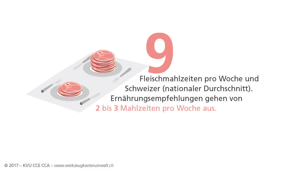 Indem wir Fleisch massvoll konsumieren und die Mengen gemäss Ernährungsempfehlungen (2 bis 3 Portionen à 100 bis 120 Gramm pro Woche, einschliesslich Geflügel und Wurstwaren) senken, verringern wir die ernährungsbedingte Umweltbelastung um 20 bis 40%.