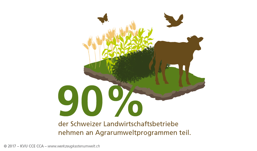 In der Schweiz ist die Landwirtschaftspolitik seit 1990 immer umwelt- und tierfreundlicher geworden. Über 95% der landwirtschaftlichen Betriebe nehmen an Agrarumweltprogrammen teil und erbringen den ökologischen Leistungsnachweis (ÖLN). Sämtliche Schweizer Betriebe halten sich bei der Produktion an das Pflichtenheft der integrierten (IP) oder der biologischen Produktion (Bio). Die Agrarpolitik richtet sich auf die Anliegen der Schweizer Bevölkerung aus, die ihrer Ernährung von der Aussaat bis zur Entsorgung immer mehr Beachtung schenkt, um sich verantwortungsbewusst und nachhaltig zu ernähren. 2008 haben das Bundesamt für Umwelt (BAFU) und das Bundesamt für Landwirtschaft (BLW) 13 Umweltziele für die Landwirtschaft (UZL) festgelegt. 2016 erwähnte der Bundesrat im Anschluss an den Bericht «Natürliche Lebensgrundlagen und ressourceneffiziente Produktion. Aktualisierung der Ziele», dass es seit 2008 messbare Fortschritte gegeben habe (Erhaltung von einheimischen Sorten und Nutztierrassen, Biodiversitätsförderflächen [BFF], Gebiete ohne synthetische und biologische Betriebsmittel in der Nähe von Oberflächengewässern).