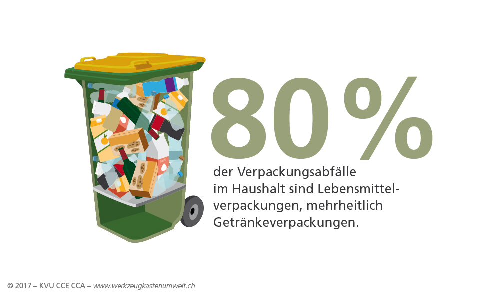 - 80% der Verpackungsabfälle sind Lebensmittelverpackungen, mehrheitlich für Getränke.