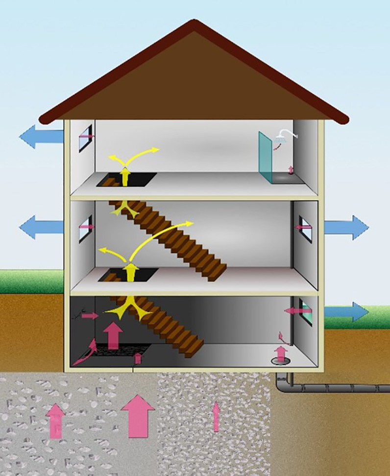 - Luftzirkulation im Gebäudeinneren: Warme Luft steigt in Gebäuden auf, vor allem während der Heizperiode, und erzeugt in den unteren Stockwerken einen geringen Unterdruck. Das ist der Kamineffekt, der hauptverantwortlich ist für den Transport von Radon vom Boden ins Innere des Hauses; im Allgemeinen findet man höhere Konzentrationen im Keller und in den Erdgeschossen.