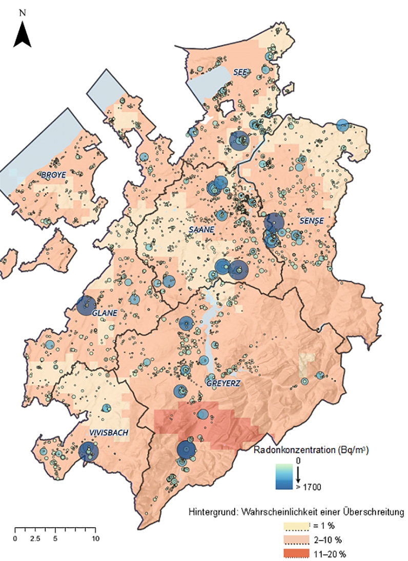 In der Schweiz befinden sich die Gebiete mit hohen Radonkonzentrationen hauptsächlich im Jura und in den Alpen. Aber auch im Schweizer Mittelland gibt es Gebäude mit hohen Werten. Aufgrund der Variabilität von Böden, Gebäuden und Nutzergewohnheiten können die lokalen Unterschiede sehr gross sein, auch zwischen zwei benachbarten Gebäuden. Deshalb kann die tatsächliche Radonkonzentration in einem bestimmten Gebäude nur mit Messungen bestimmt werden.
