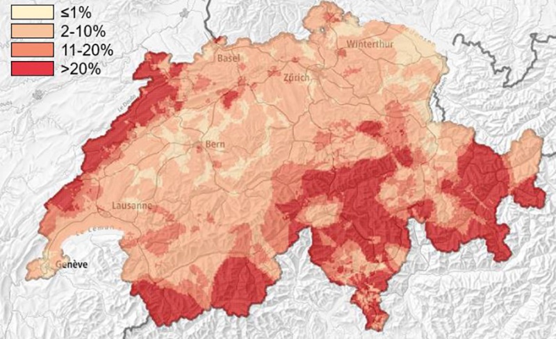 Vergrössern Karte zur Wahrscheinlichkeit, dass der Referenzwert für Radon (300 q/m3) in Gebäuden überschritten wird © BAG, www.radonkarte.ch