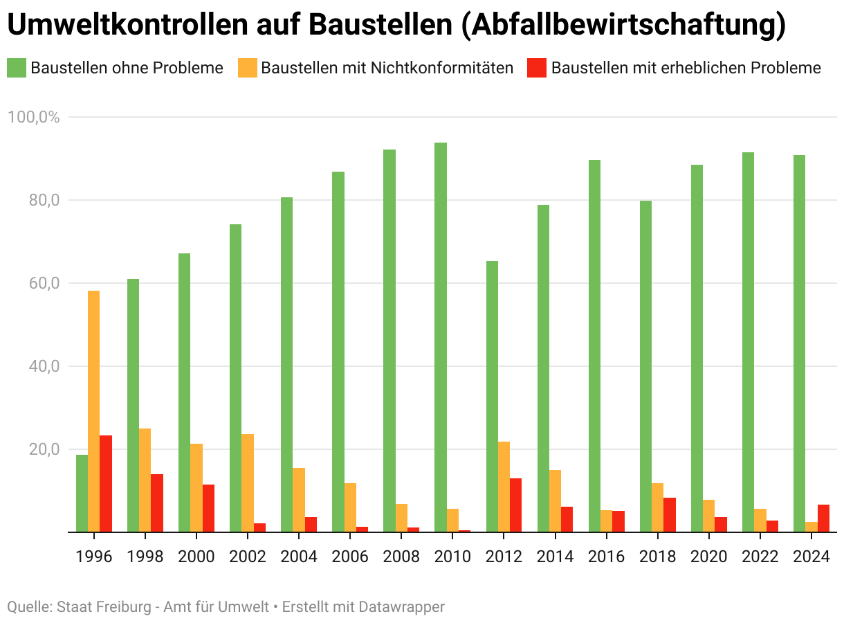 - Dank der Kontrolle der Baustellen und der strengen Überwachung problematischer Fälle sowie einer anhaltenden Sensibilisierung vor Ort kann eine konforme Abfallbewirtschaftung gewährleistet werden.
