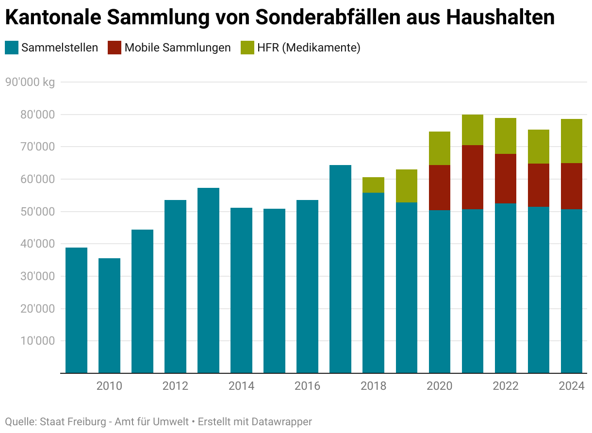 Um eine qualitativ hochwertige Sortierung sicherzustellen, die eine gesetzeskonforme Lagerung und Beförderung ermöglicht, stellt der Kanton den Haushalten ein Sammelsystem für ihre Sonderabfälle zur Verfügung. Dieses umfasst 9 permanente Sammelstellen sowie zweimal im Jahr stattfindende mobile Sammlungen.