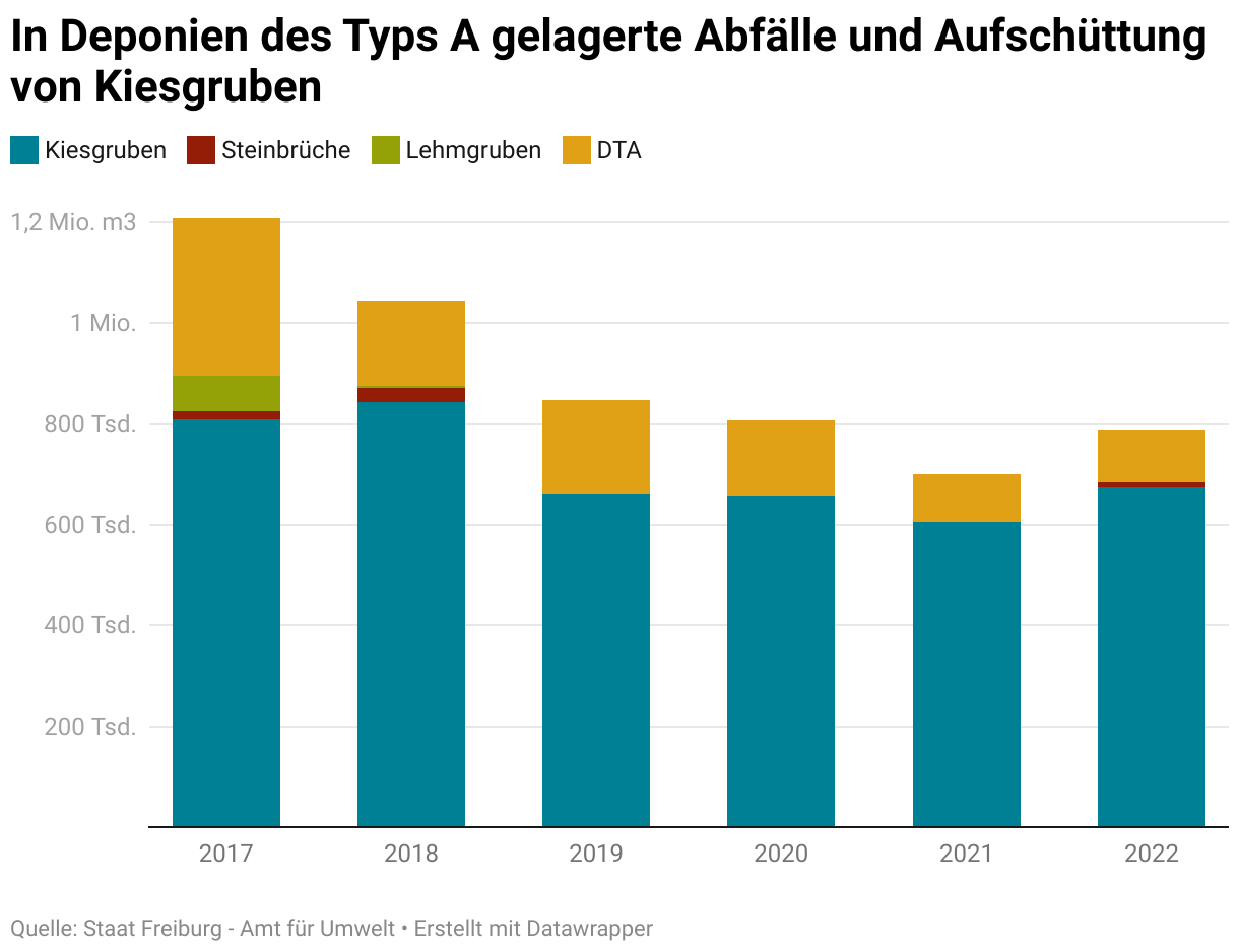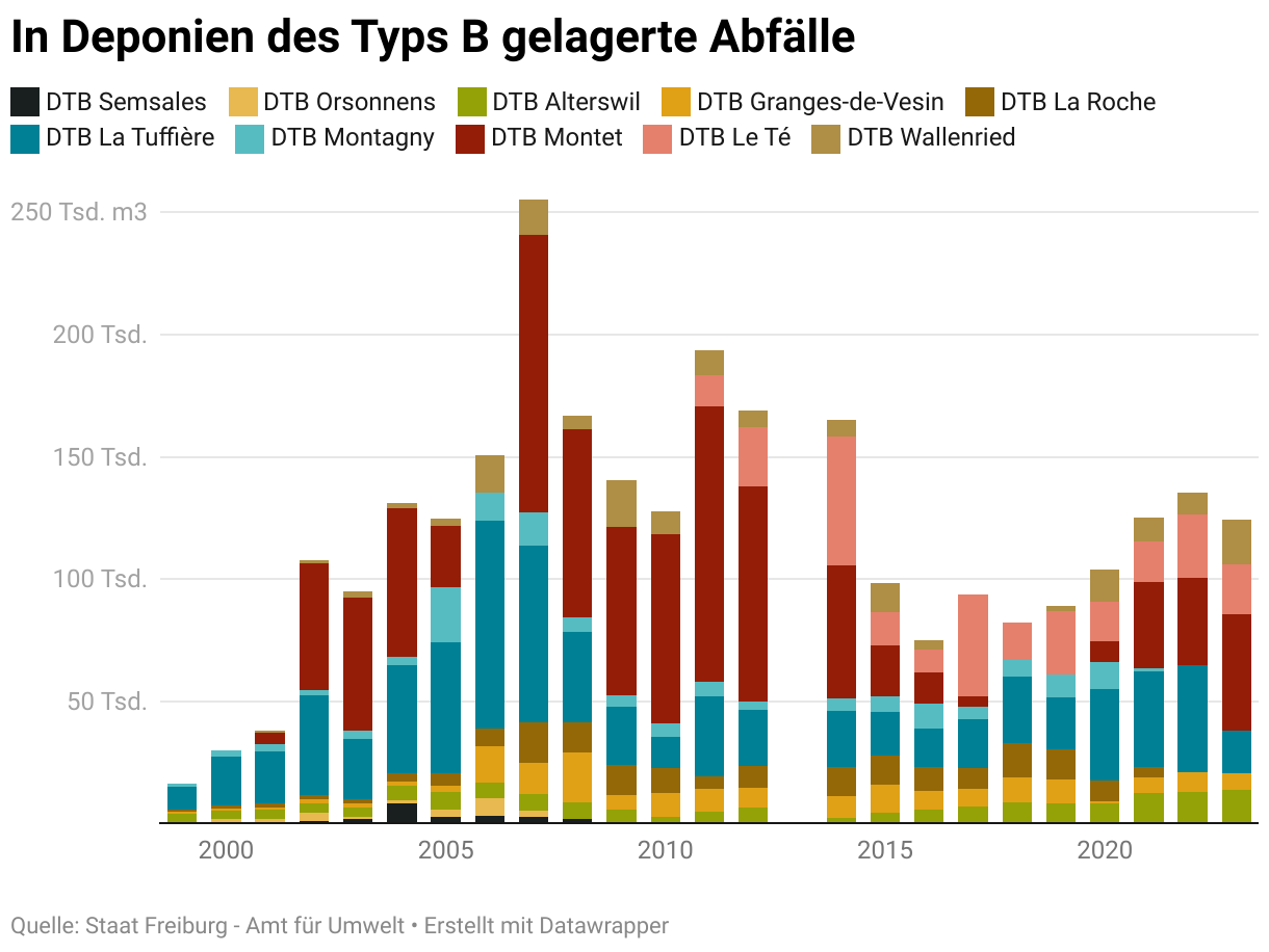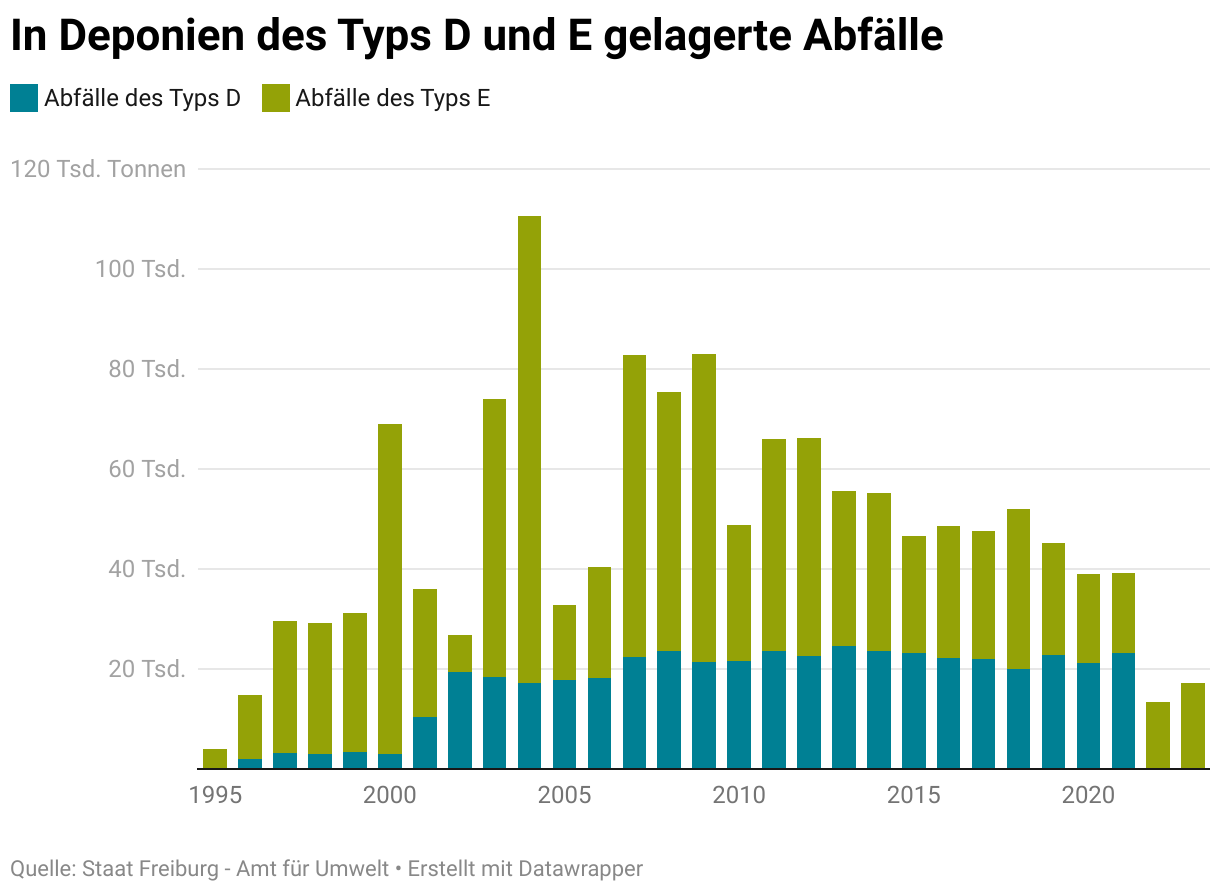 - Im Rahmen der derzeit laufenden Revision der kantonalen Abfallplanung wird eine umfassende Analyse des Netzes der Abfallbehandlungsanlagen auf dem Kantonsgebiet durchgeführt. Darüber hinaus werden in dieser Planung die für die kommenden Jahre vorzusehenden Kapazitäten festgelegt, wobei die Eröffnung neuer Standorte oder Anlagentypen sowie die interkantonale Koordination für bestimmte Abfälle, wie Sonderabfälle oder Abfälle, die in Deponien des Typs D oder E zulässig sind, berücksichtigt werden. Gegenwärtig ist die Lage in der Westschweiz hinsichtlich der Suche nach Deponien des Typs D kritisch. Da die Deponie des Typs D in Châtillon ausgelastet ist, wird die Freiburger Schlacke seit 2022 zur Deponie Boécourt im Kanton Jura transportiert. Die Eröffnung eines neuen Deponiefeldes D in Châtillon ist für Anfang 2027 geplant. Gleichzeitig wird im Kanton Freiburg eine Anlage zur Rückgewinnung von verwertbaren Stoffen aus Schlacke gebaut. Dadurch dürfte sich das in Deponien gelagerte Volumen verringern.
