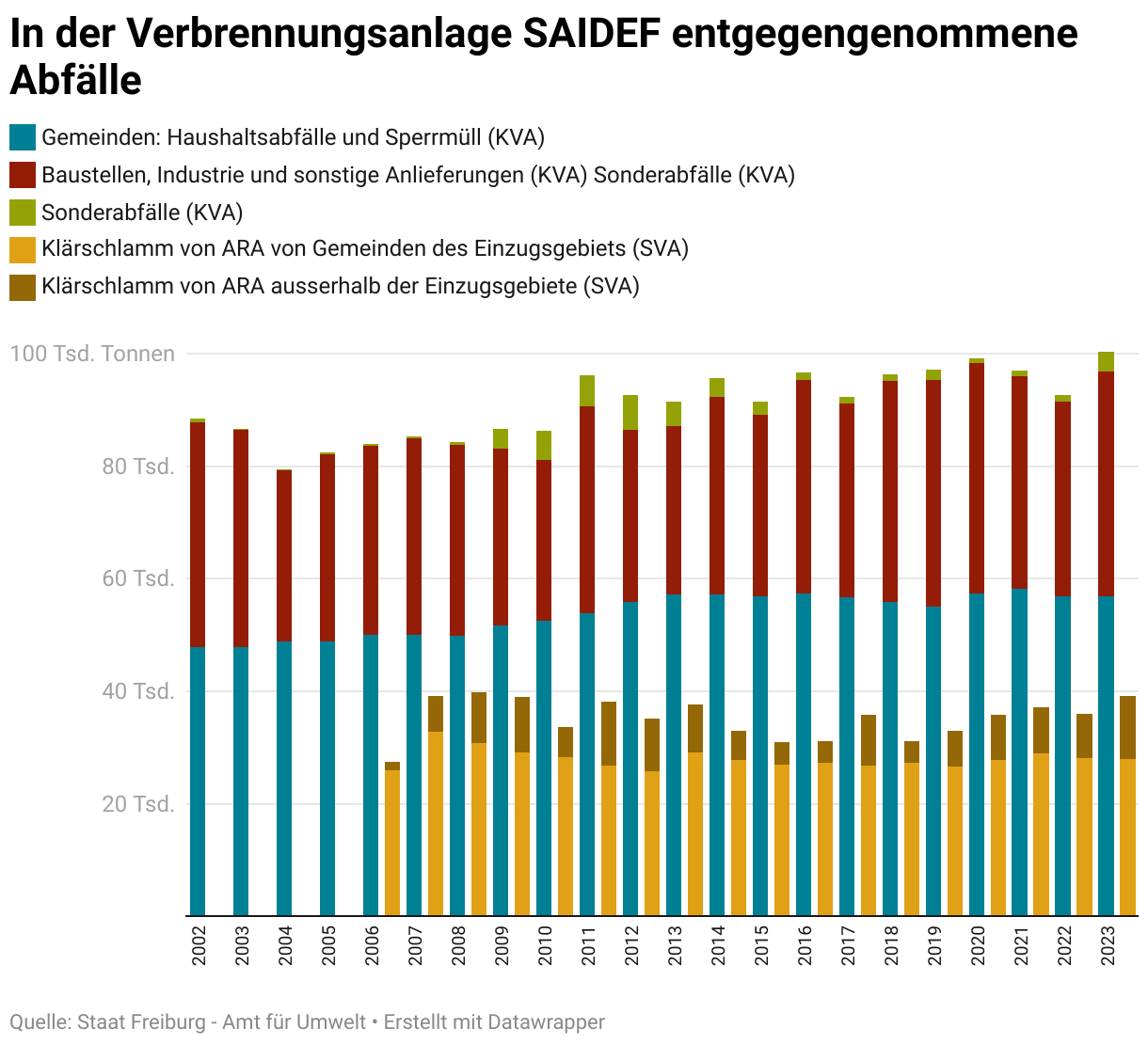 Gemäss Bundesgesetzgebung müssen verbrennbare Siedlungsabfälle in geeigneten Anlagen thermisch behandelt werden, soweit sie nicht stofflich verwertet werden können. Diese Verpflichtung gilt für brennbaren Haushaltsabfall und Sperrmüll, der von den Gemeinden gesammelt wird, sowie für Abfälle gleicher Art, die von öffentlichen Verwaltungen und Unternehmen mit weniger als 250 Vollzeitstellen stammen. Die Entsorgung von Siedlungsabfällen unterliegt der Planung der Kantone und muss die von diesen festgelegten Einzugsgebiete berücksichtigen. Im Kanton Freiburg müssen Siedlungsabfälle in der thermischen Verwertungsanlage der SAIDEF AG entsorgt werden. Diese übernimmt auch die Behandlung anderer Abfälle, wie beispielsweise Abfälle von Unternehmen oder Klärschlamm.