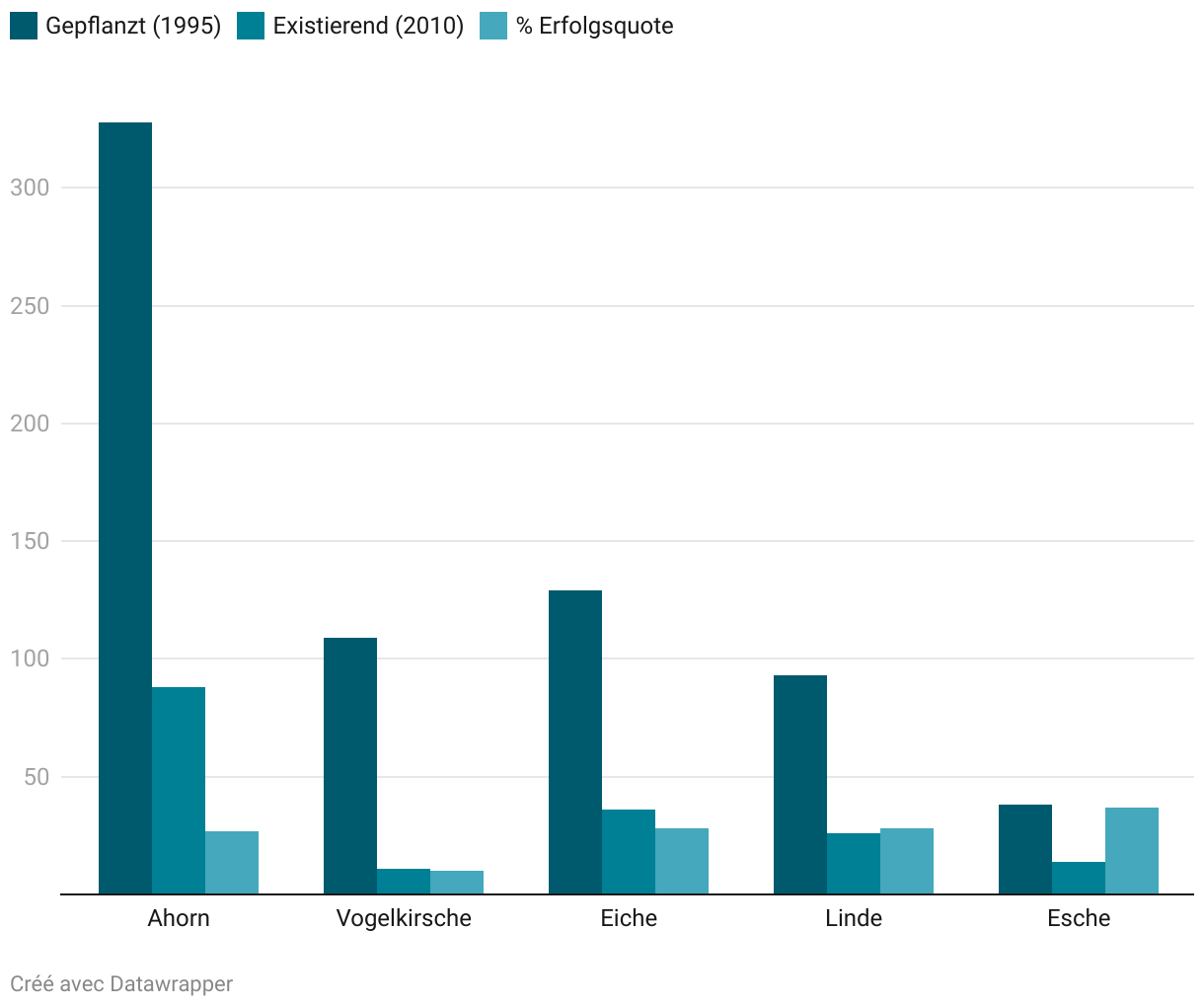 25% der Einzelbäume, die im Jahre 1995 anlässlich des „Europäischen Jahres des Naturschutzes“ gepflanzt wurden, bestanden im Jahre 2010, „Internationales Jahr der Biodiversität“, noch. Diese Bäume haben einen durchschnittlichen Durchmesser von 14 cm. Sie haben sich demzufolge ziemlich gut entwickelt. Gemäss der Beurteilung der Förster, welche das Inventar durchgeführt haben, sind 80% vital und 7% ziemlich vital. Nur 13 % weisen Schwächezeichen auf, wie Verletzungen, trockene Zweige, eine wenig entwickelte Krone, ein schwaches Wachstum oder einen hohen Wuchs.