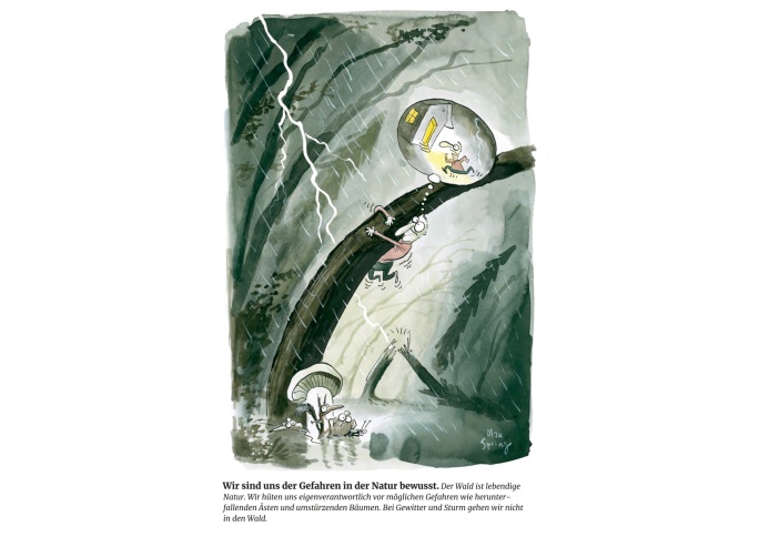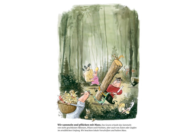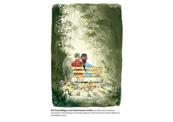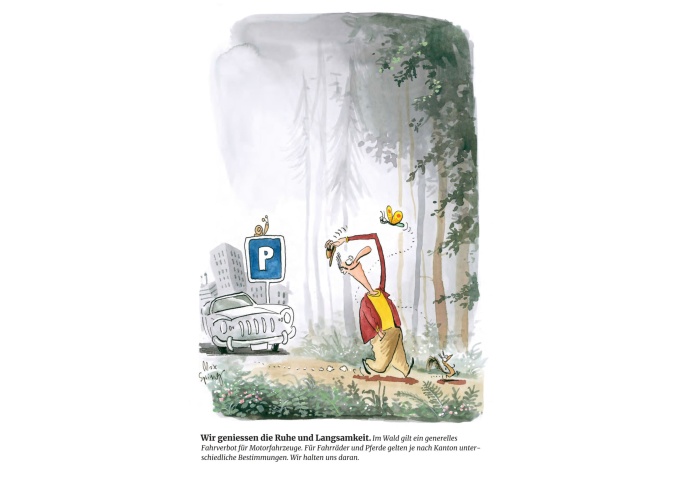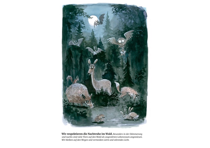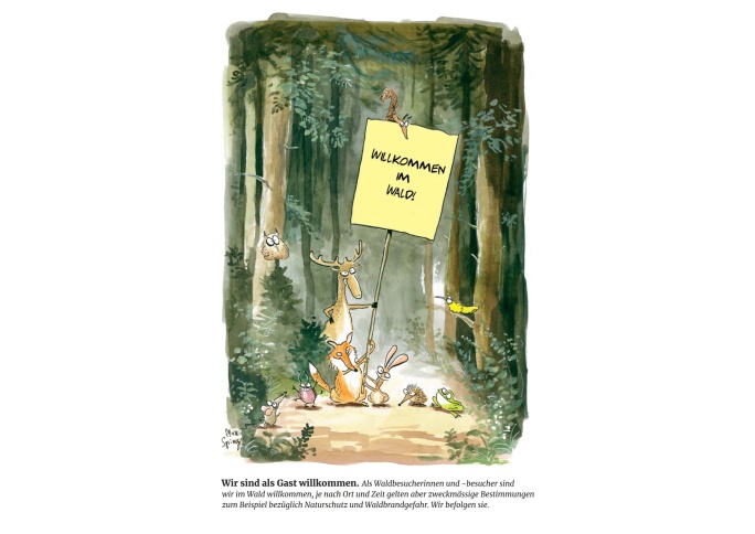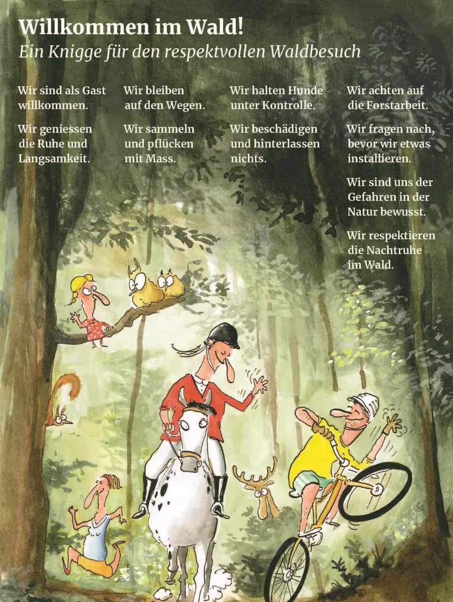 Auf Initiative der Arbeitsgemeinschaft für den Wald haben 20 Schweizer Organisationen zehn kleine Prinzipien ausgearbeitet, um den Wald zu geniessen und ihn gleichzeitig zu schützen. Der "Wald-Knigge " ladet Waldbesucher ein, einige einfache Regeln zu befolgen, um den Wald, seine Bewohner und andere Besucher zu schonen.
