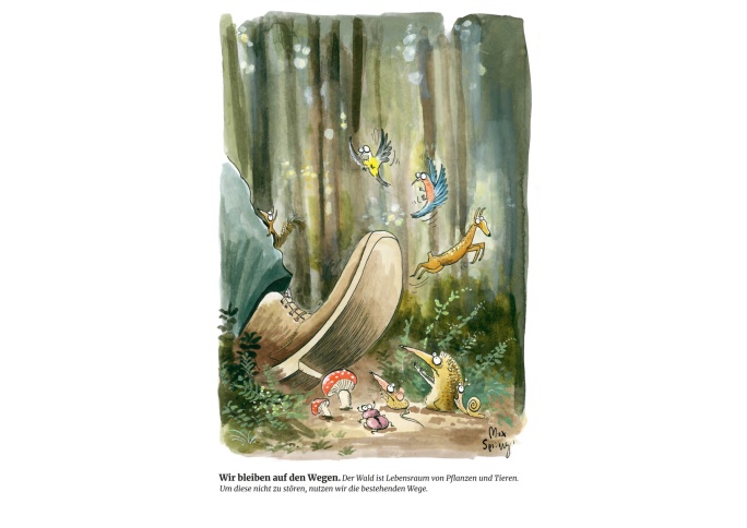 Weitere Informationen zu diesem Leitfaden finden Sie auf der Seite der Arbeitsgemeinschaft für den Wald (Link: Arbeitsgemeinschaft für den Wald | Wald-Knigge: zehn Tipps für einen respektvollen Waldbesuch ). Dort können Sie unter anderem Informationsblätter zu jedem der zehn Prinzipien sowie ein pädagogisches Dossier herunterladen.