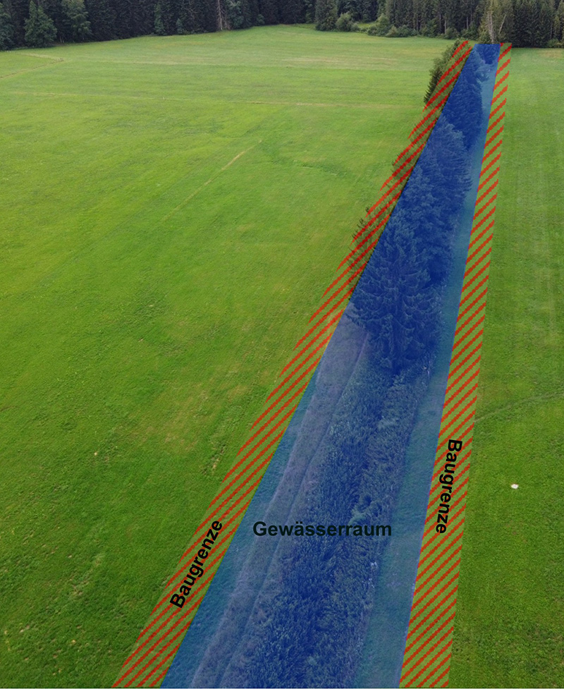 Bei kleinen Fliessgewässern (natürliche Breite 1–1,5 m) entspricht der Gewässerraum (GWR) ungefähr der Pufferzone, also rund 6 m.