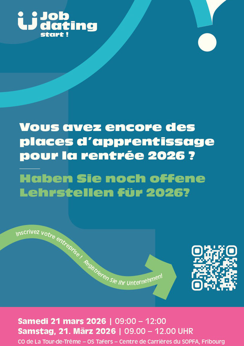 Am Samstag, den 21. März 2026 organisiert der Verband Forum der Berufe START! im Kanton Freiburg die achte Ausgabe von START! Job dating. Das Ziel dieser Veranstaltung ist es, die Unternehmen und die Schüler/-innen der Orientierungsschulen im Hinblick auf eine eventuelle Lehrstelle in Kontakt zu bringen.