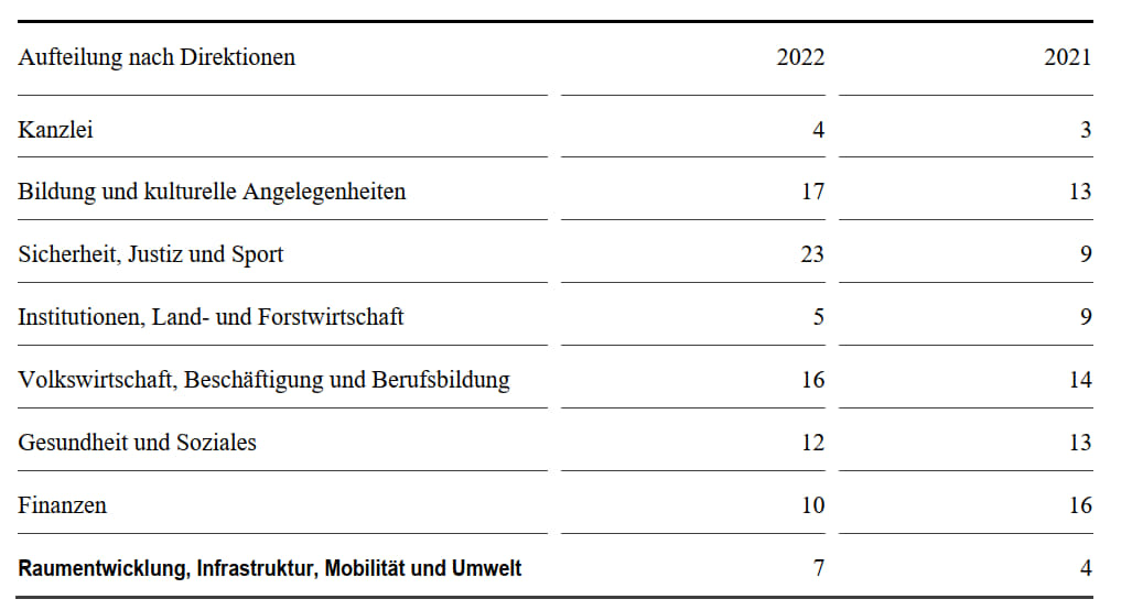 Das FI, das administrativ der FIND zugewiesen, in der Erfüllung seiner Aufgaben jedoch unabhängig ist, gab im Jahr 2022 91 Auditberichte heraus und gab 44 Empfehlungen ab. Das detaillierte Verzeichnis der Kontrollarbeiten und der per 31. Dezember 2022 noch offenen Empfehlungen wurde dem Staatsrat und der Finanz- und Geschäftsprüfungskommission des Grossen Rates zugestellt.