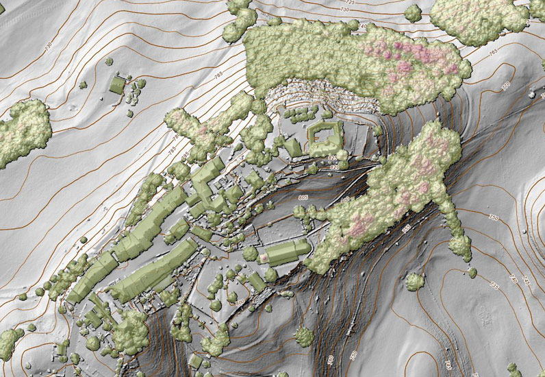 Auf Grundlage der gemessenen Punkte konnten zwei Referenzprodukte erzeugt werden: ein digitales Terrainmodell (DTM), das die Höhe des "blanken" Geländes bereitstellt, und ein digitales Oberflächenmodell (DOM), welches die Höhe von Bäumen und Gebäuden wiedergibt. Basierend auf diesen beiden Produkten, konnten anschliessend weitere Daten generiert werden.