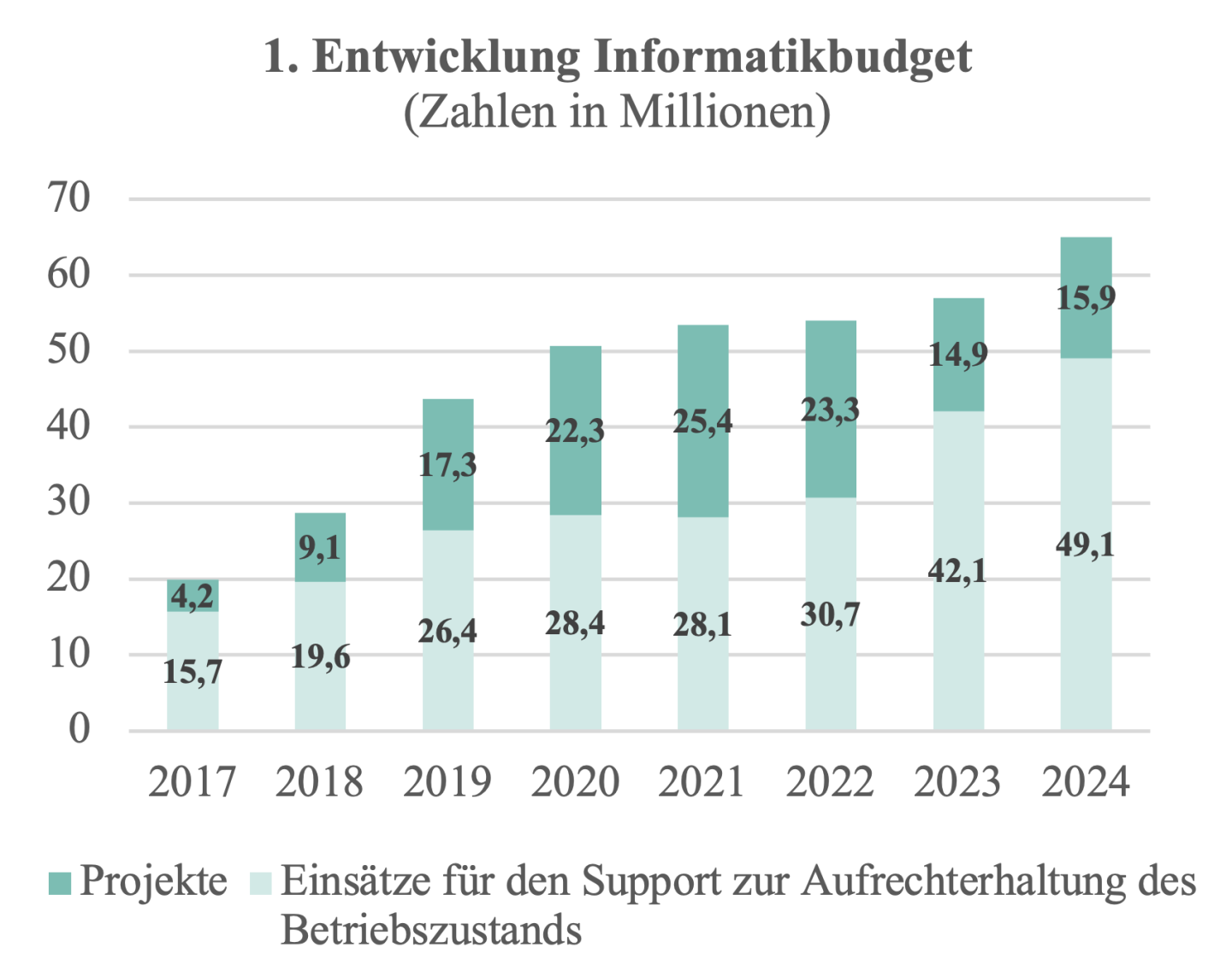 Beim Umfang der Supportleistungen für die Nutzer/innen ist mit 25 000 Vorfällen und 31 000 Anfragen eine Zunahme um + 25 % bzw. + 4 % gegenüber 2023 zu verzeichnen. Ausserdem initiierte das ITA 2024 rund 20 neue Wartungsaufträge von den 60 in diesem Jahr bearbeiteten. Was das Budget betrifft, hat der Anteil des Supports zur Aufrechterhaltung des Betriebszustands am Informatikbudget gegenüber 2023 markant zugenommen (s. Grafik 1 unter Punkt 5.6.2.6, hellgrüner Bereich im Säulendiagramm).