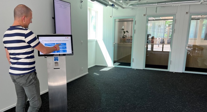Der zentrale KSTV-Schalter umfasst einen Empfangsbereich mit einem Zuweisungssystem mit nummerierten Tickets. In diesem neuen Bereich werden neben den Räumen für die Öffentlichkeit auch die im Kontakt mit den Steuerpflichtigen tätigen Mitarbeitenden ihren Arbeitsplatz haben. Insbesondere wurde die Einrichtung so konzipiert, dass die Personenströme zwischen den für die Bevölkerung zugänglichen Räumen und den Arbeitsplätzen besser getrennt werden können.