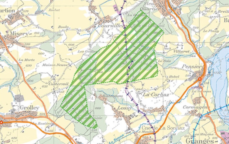 Das Windenergiegebiet «Collines de la Sonnaz» befindet sich im Saane- und im Seebezirk auf rund 650 m Höhe, nordwestlich der Stadt Freiburg.