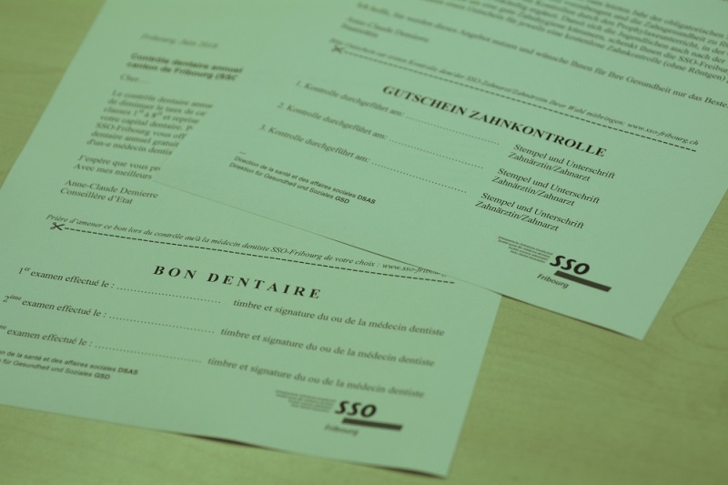 Die Freiburger Zahnärzte-Gesellschaft (SSO-Freiburg) und die Direktion für Gesundheit und Soziales (GSD) bieten gemeinsam eine Präventionsmassnahme zur Aufrechterhaltung der Zahngesundheit der Jugendlichen an: Dentalgutscheine für die Schülerinnen und Schüler der 11. HarmoS. Schulabgängerinnen und Schulabgänger erhalten von ihrer Schule einen Dentalgutschein für drei Zahnkontrollen in drei aufeinanderfolgenden Jahren. Mit diesem Gutschein können sie bei allen Zahnärztinnen und Zahnärzten, die Mitglied der SSO sind, einen Termin vereinbaren und von einer kostenlosen Untersuchung profitieren.