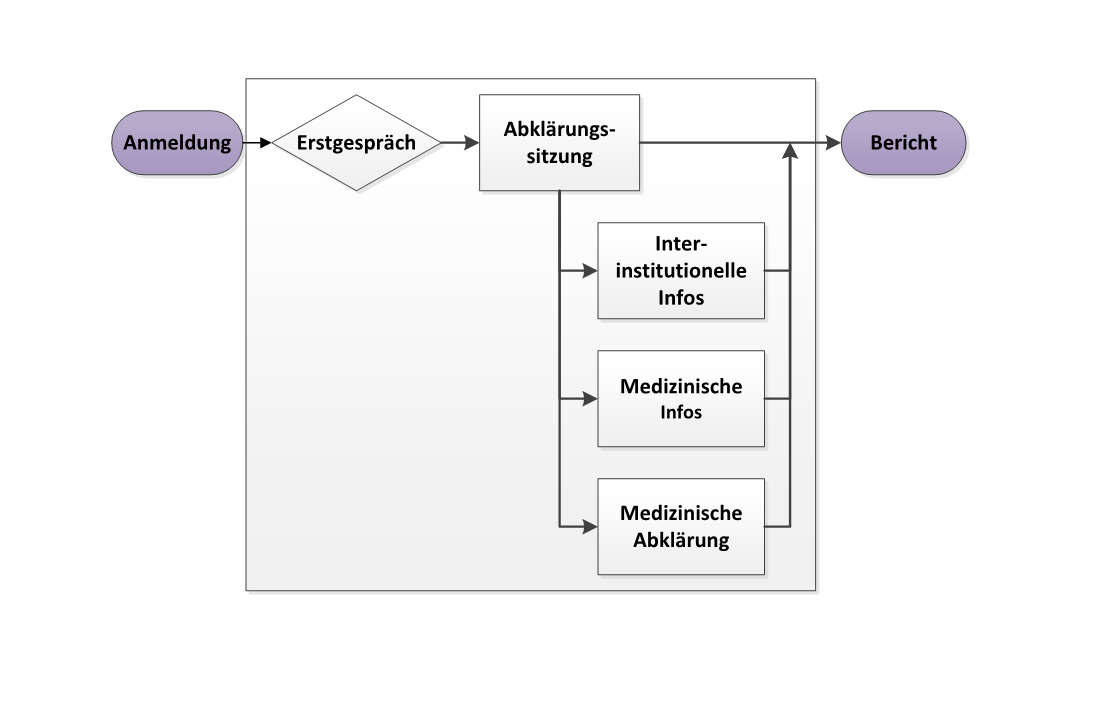 Nach der Anmeldung und dem ersten Telefongespräch werden Sie zu einem Beurteilungsgespräch mit unserem IIZ-Arzt, einem Berufsberater der IV-Stelle (IVSt), der Regionalen Arbeitsvermittlungen (RAV) und der Regionalen Sozialdienste (RSD) sowie dem kantonalen IIZ-Koordinator eingeladen. Dies ermöglicht es insbesondere unserem Arzt, die Situation und den Sachverhalt gut zu erfassen, so dass er Ihre Fragen besser beantworten und danach mit den behandelnden Ärzten besser in Beziehung treten kann.