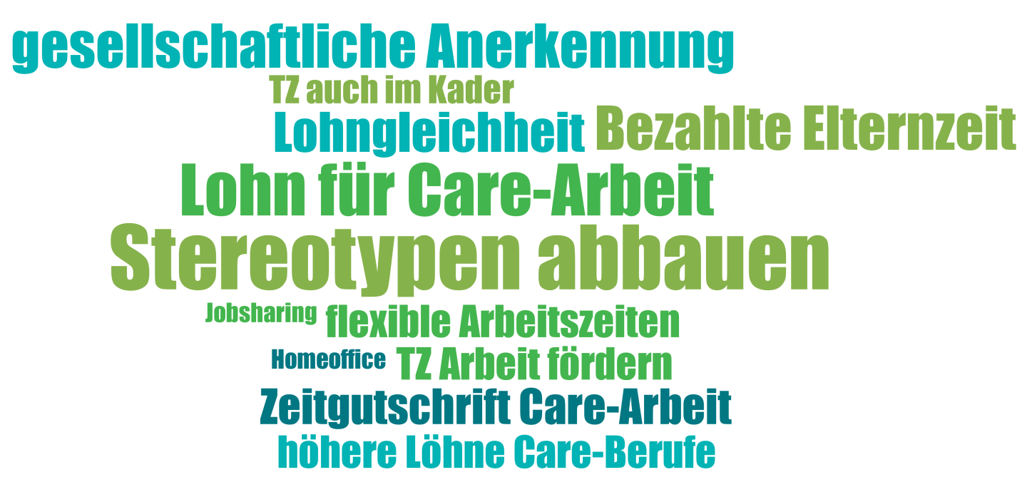 - Auch bei den von den Befragten selber eingebrachten Ideen, was für die Gleichstellung der Geschlechter bei der Care-Arbeit getan werden könnte, zeigt sich ein breites Spektrum an Antworten auf allen Ebenen – der Politik, Wirtschaft und Gesellschaft.