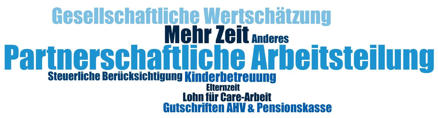 - 40 Prozent der Befragten haben auf die offene Frage geantwortet, was sie sich für ihre eigene individuelle Lebenssituation in Bezug auf Care-Arbeit wünschen. Der Wunsch nach "partnerschaftlicher Arbeitsteilung", "Mehr Zeit" und "gesellschaftlicher Wertschätzung" wird am Häufigsten genannt.