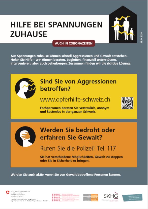 Ein breit gestreuter Aushang soll nun Abhilfe schaffen: Zahlreiche Geschäfte werden ab dieser Woche ein Plakat mit den zentralen Anlaufstellen aufhängen. Damit soll sichergestellt werden, dass Opfer von häuslicher Gewalt einen schnellen Zugang zu Hilfe finden, wenn Spannungen zuhause in Aggressionen oder Gewalt umschlagen. Der Schweizerische Apothekerverband pharmaSuisse, der Schweizerische Bäcker-Confiseurmeister-Verband sowie der Schweizerische Drogistenverband haben ihre Unterstützung bereits zugesichert. Die Verbände stellen das Plakat ihren Mitgliedern zum Aushang zur Verfügung und tragen damit zur Information der Bevölkerung bei. Alle Unternehmen, unabhängig von ihrer Branche, sind eingeladen, das Plakat auszudrucken und in ihrem Geschäft anzubringen.
