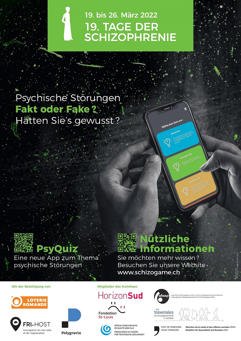 Die Tage der Schizophrenie Das Freiburger Komitee der TdS besteht aus Partnerinnen und Partnern, die im Bereich der psychischen Gesundheit tätig sind, insbesondere aus dem Freiburger Netzwerk für psychische Gesundheit (FNPG), der Freiburgische Interessengemeinschaft für Sozialpsychiatrie (AFAAP), einer betroffenen Person, der Fondation St-Louis, dem Verein Les Traversées, der Stiftung Horizon Sud und der GSD. |