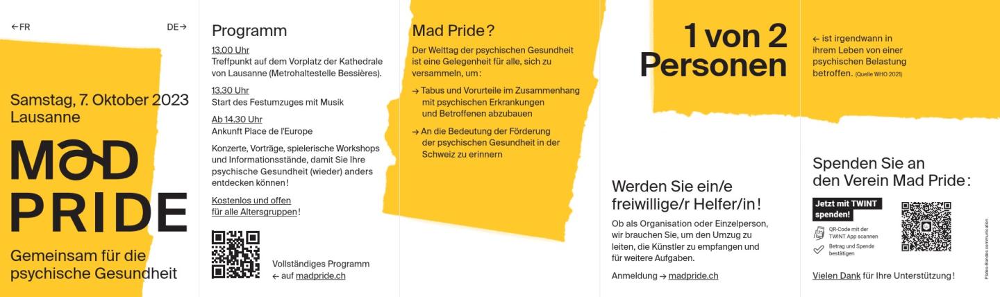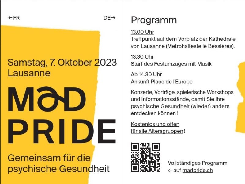 Die Ausstellung «Mad Pride Fribourg» mit Postern der Vereine Coraasp, Minds und Stop Suicide wird vom 2. bis am 16. Oktober während der Öffnungszeiten des Gebäudes der HEdS-FR frei zugänglich sein. Die Poster thematisieren die psychische Gesundheit und enthalten Ressourcen, Erfahrungsberichte und QR-Codes zum Aufrufen von Podcasts.