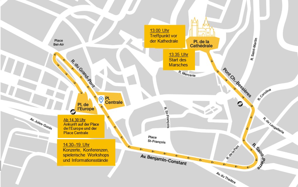 Die Bevölkerung ist eingeladen, sich am Samstag, dem 7. Oktober, ab 13 Uhr vor der Kathedrale in Lausanne einzufinden. Der Marsch startet um 13.30 Uhr und führt zur Place de l’Europe und zur Place Centrale (siehe Wegbeschreibung unten); angeführt wird er von der Companie Makadam und den Perkussionsinstrumenten des Orchesters der Graap-Fondation. Am Ende der Marschkolonne ist ein ruhigerer Bereich für sensiblere Personen vorgesehen. Alle sind eingeladen, in Gelb zu kommen (von Kopf bis Fuss oder zumindest teilweise) und ein Plakat mit einer persönlichen Botschaft mitzubringen!